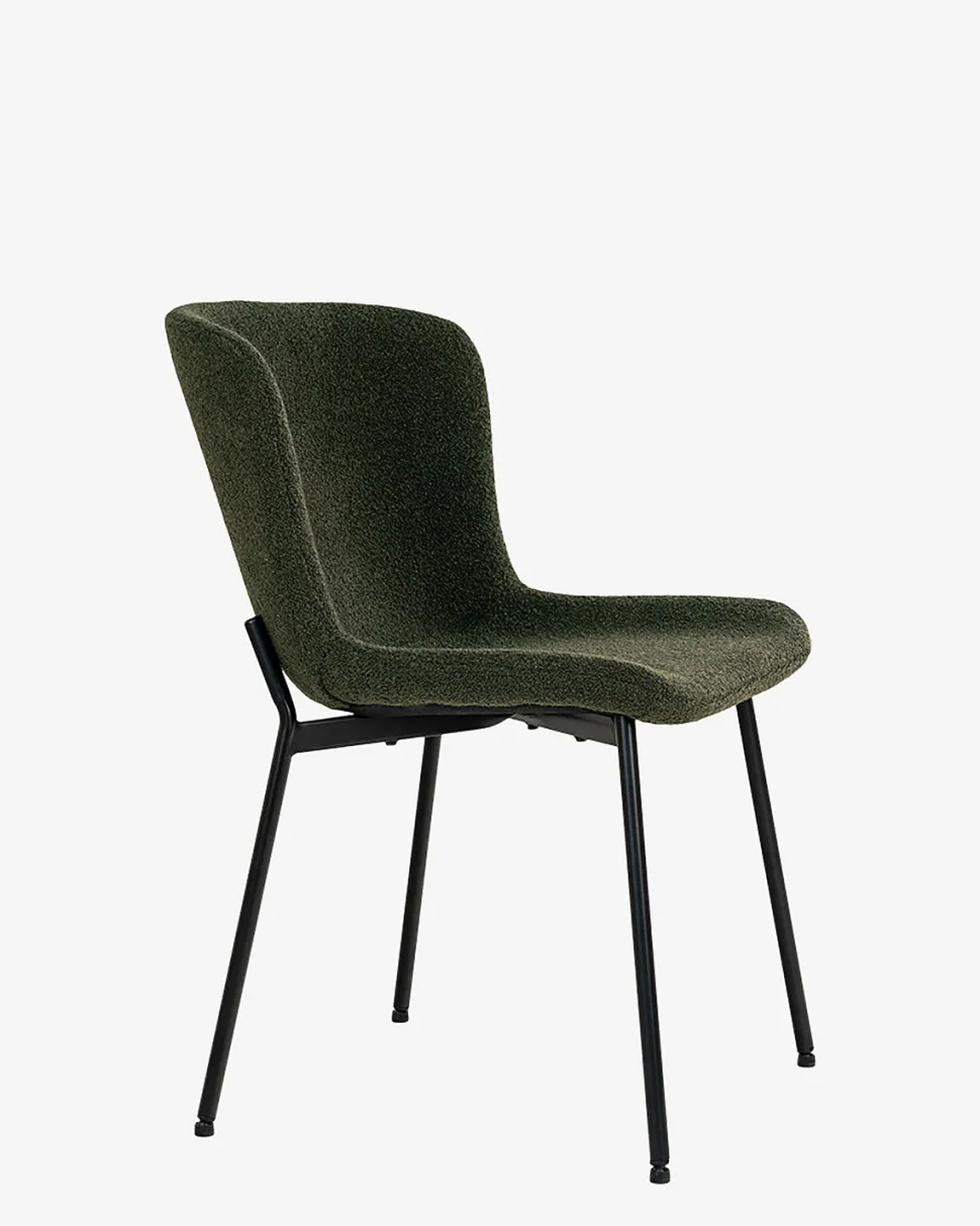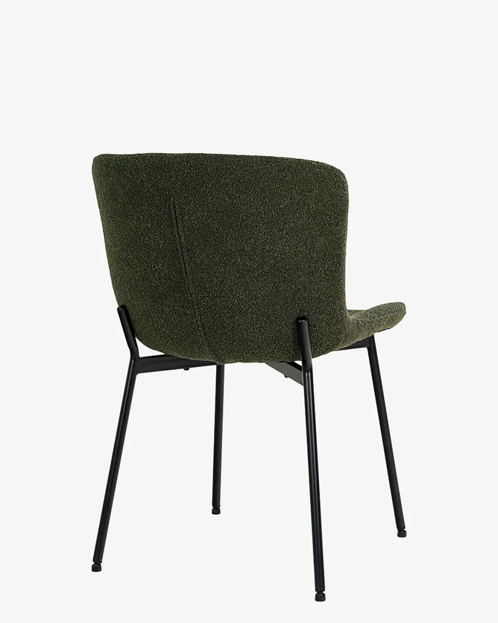 Maceda er en elegant spisebordsstol i mørkegrøn bouclé stof. Den er både komfortabel og indbydende.