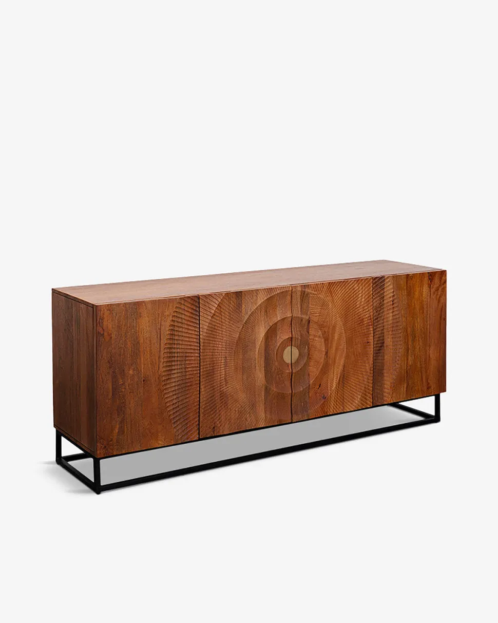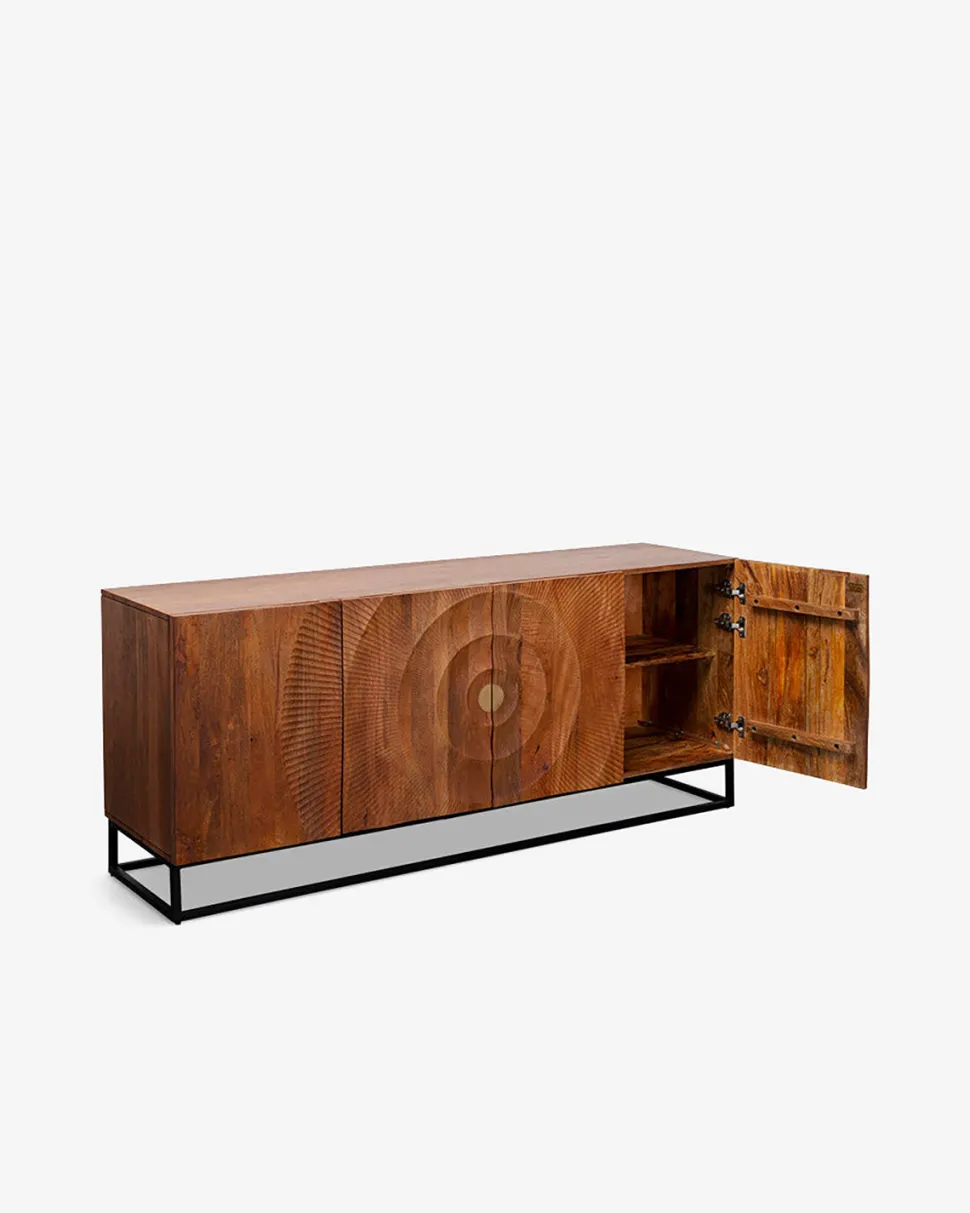 Skulpturelt frontdesign med håndlavede, udskårne mønstre gør skænken til et yndet møbel, der udstråler boho. Skænken har god plads indeni med en fastmonteret hylde på hver side.