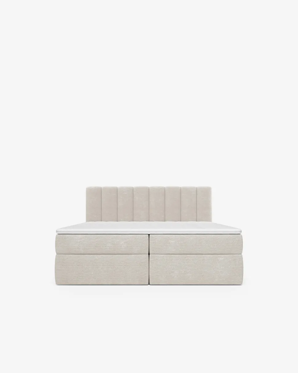Sengens elegante design går helt til gulvet, og giver et utroligt eksklusivt udseende, der fremhæves af en flot hovedgavl med lodrette syninger.