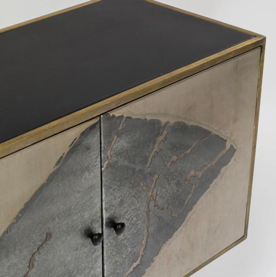 Elegant Mancha skænk i oxideret stål. Skænken har 4 låger med en hylde i midten, samt sorte metalben.