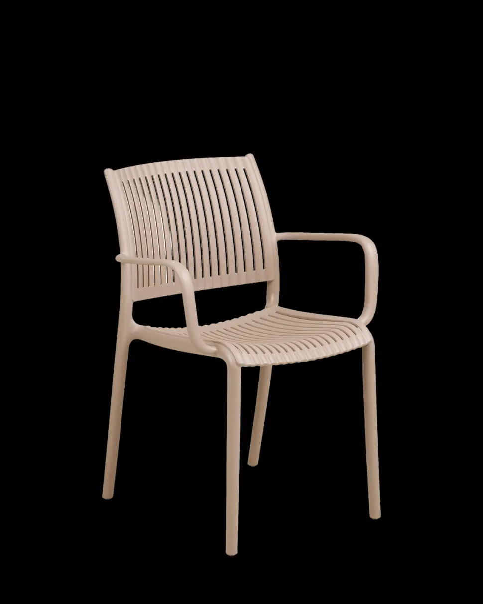 Manzano havestol med armlæn i taupe, UV-resistent PP plast. Stabelbar og vedligeholdelsesfri.