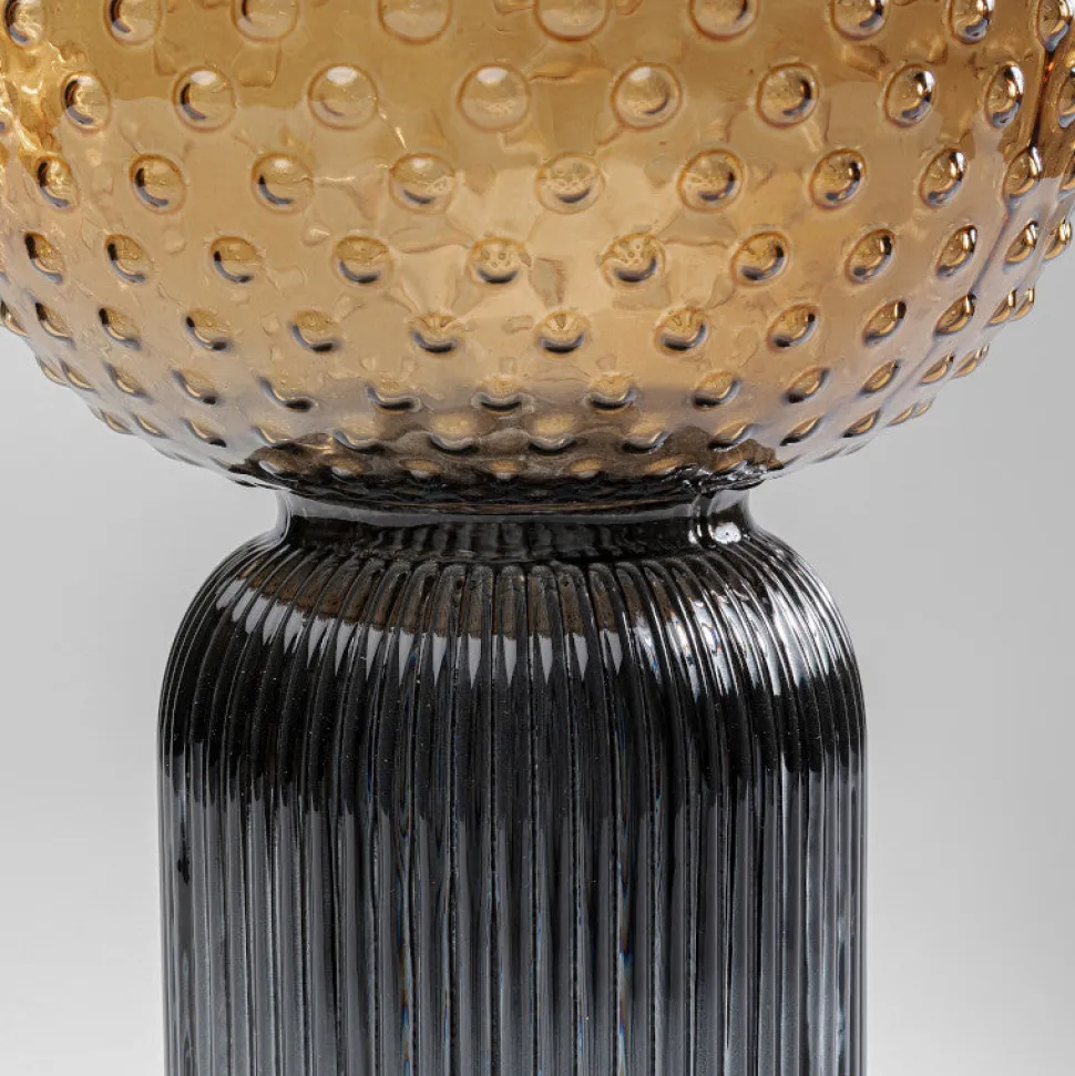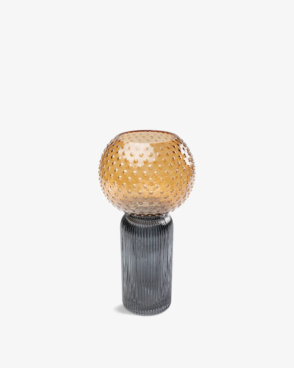 Marvelous vasen er en dekorativ glasvase, der kombinerer varme farver og spændende strukturer. Den er udført i gul/amberfarvet glas med små knopper på overdelen og en bund i røget glas med elegante lodrette riller.