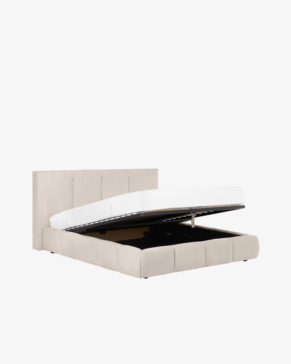 Under madrassen findes et stort og lettilgængeligt opbevaringsrum, som åbnes ved at løfte i fodenden. Det giver en smart løsning til opbevaring af dyner, puder og sengetøj – særligt når pladsen skal udnyttes effektivt.