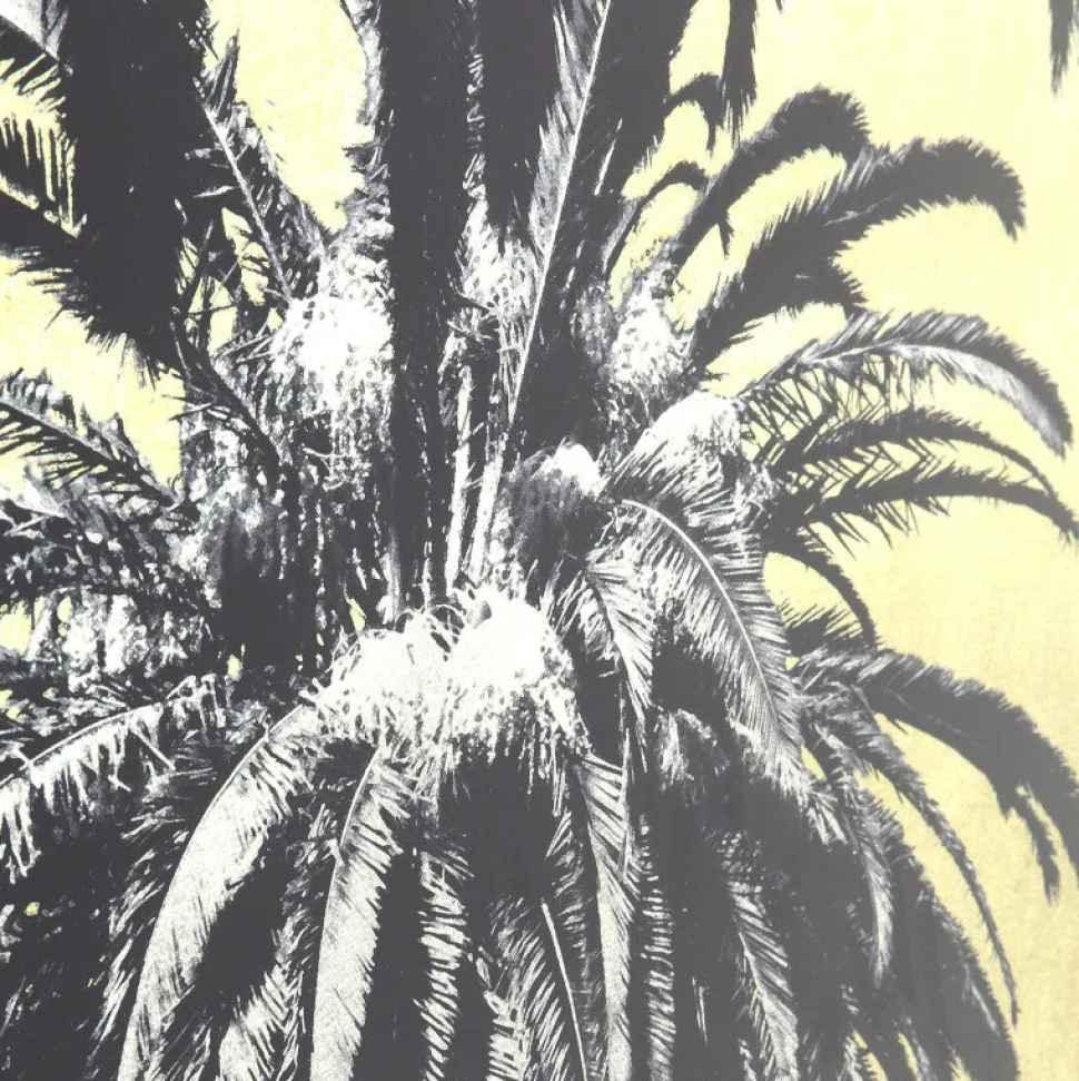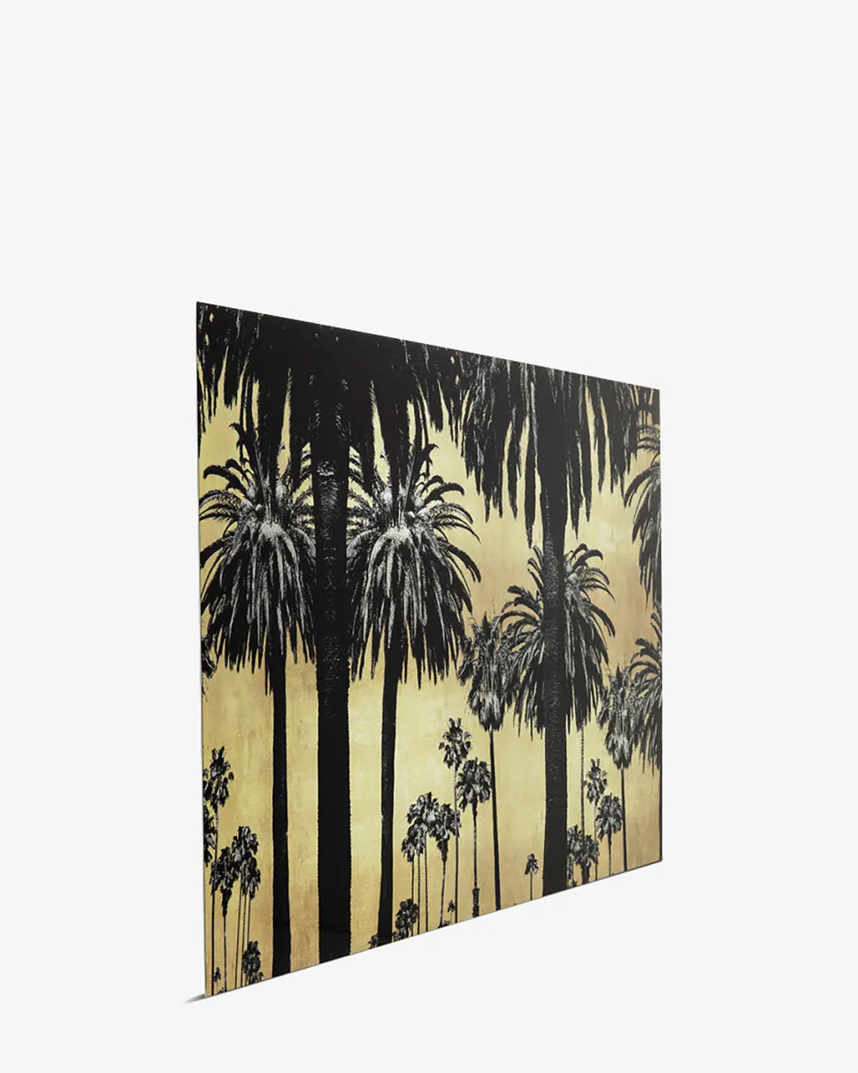 Er du på udkig efter lidt anderledes vægkunst, så tjek lige dette glasbillede med palmer og gul himmel mellem palmerne.