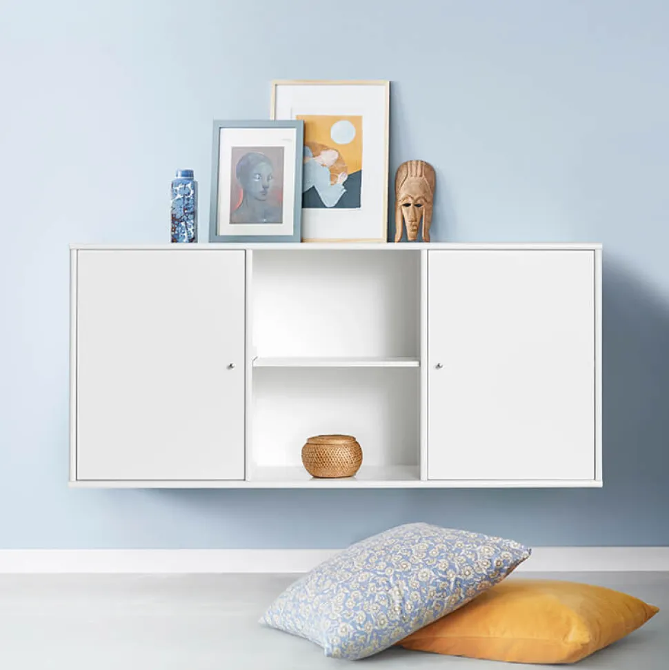 Denne skænk er produceret i hvid, og bag de 2 låger findes der to brede rum, opdelt af en flytbar hylde, så man nemt kan opbevare de nødvendige ting i entréen eller stuen.