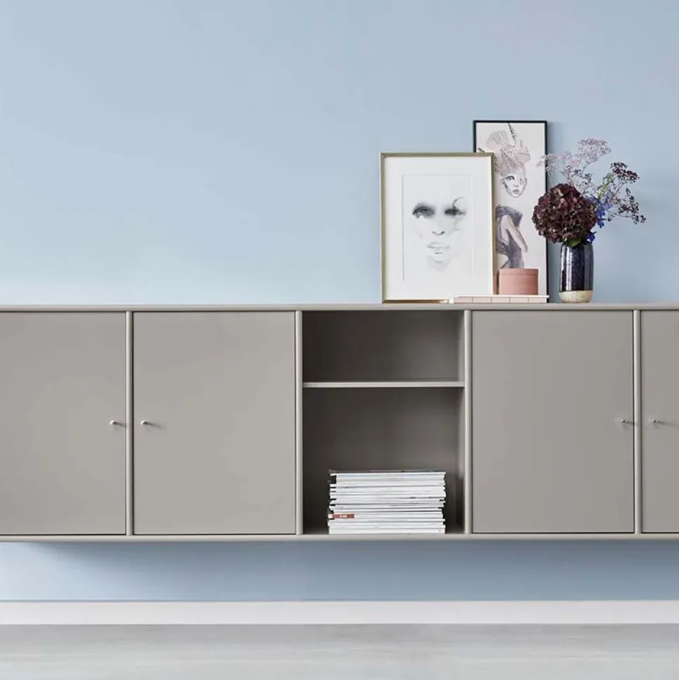 Denne skænk er produceret i lys grå lak. En meget klassisk opbygning med 4 låger og åbent rum i midten, som passer ind i indretningen i de fleste hjem.