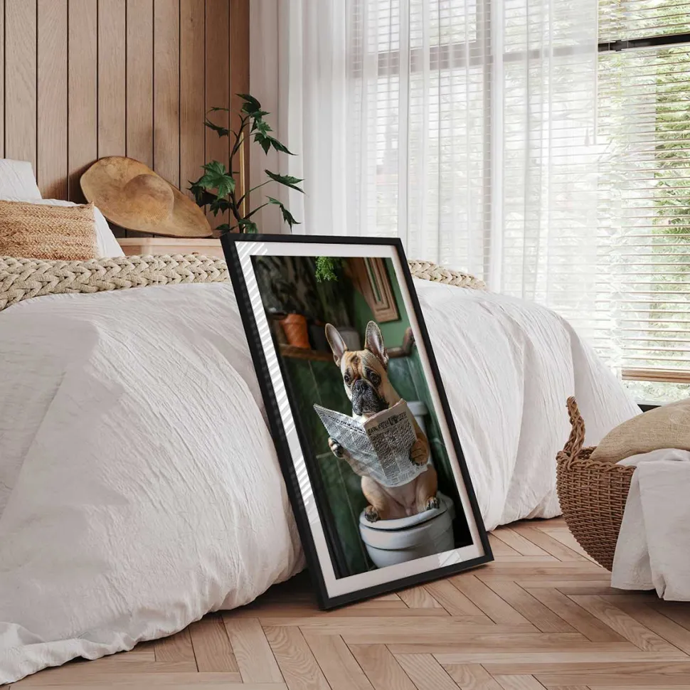 Mopper på toilet er et sjovt billede med en nuttet mops, der sidder afslappet på et toilet, mens den læser avisen og hygger sig i fred og ro.