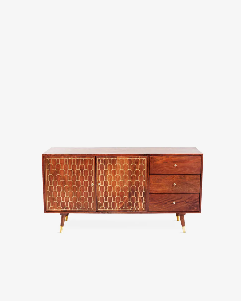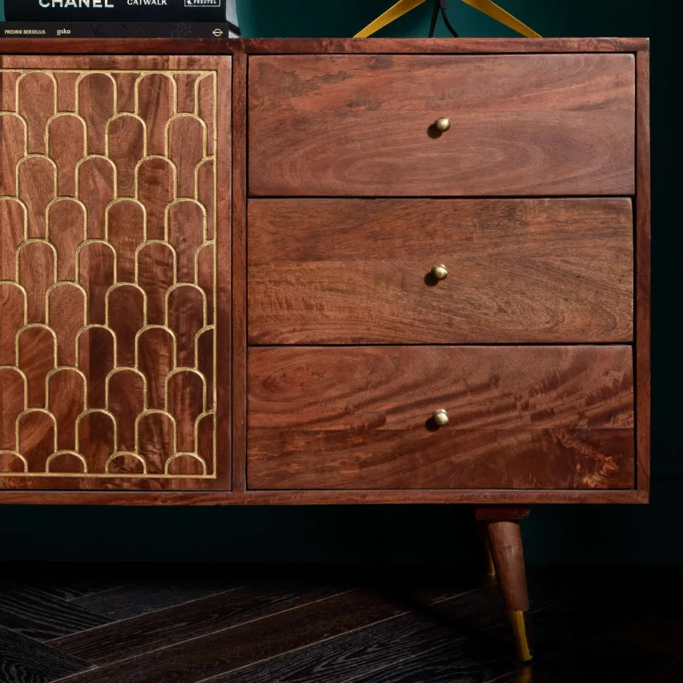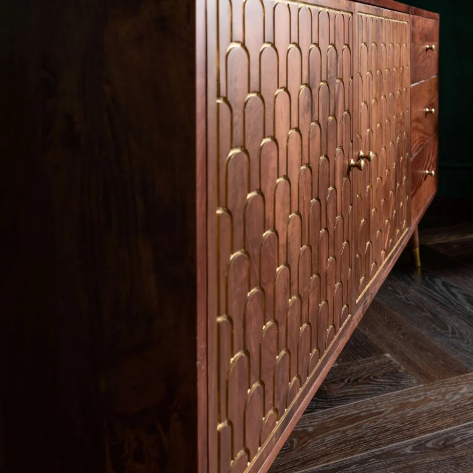 Muskat skænken er et elegant møbel med et eksotisk præg. Den er udført i mørkt mangotræ med smukke udskæringer på fronter, hvor fine guldfyldninger fremhæver mønstrene og giver et eksklusivt spil i overfladen. De slanke ben afsluttes med messingdetaljer, der fuldender det raffinerede udtryk.