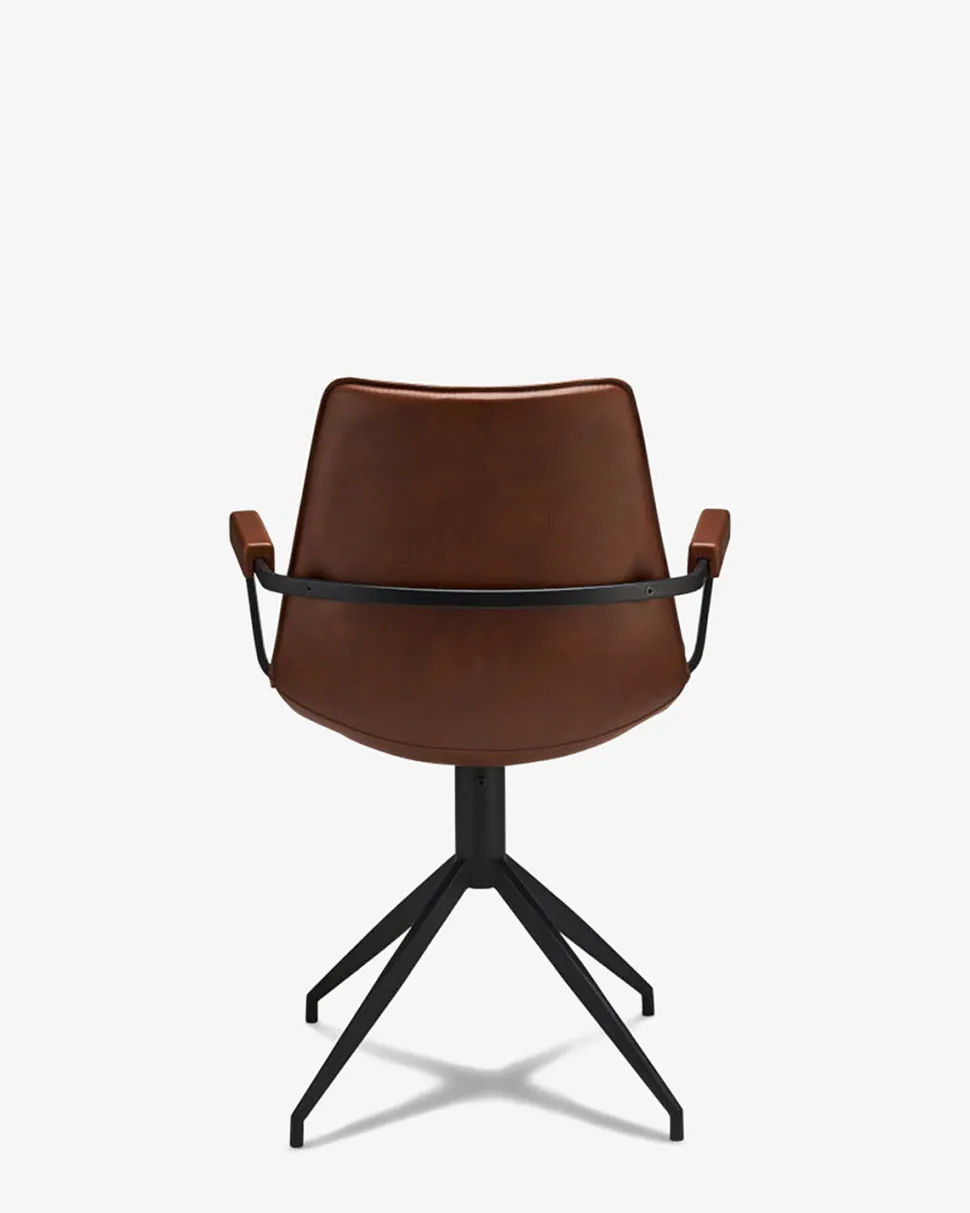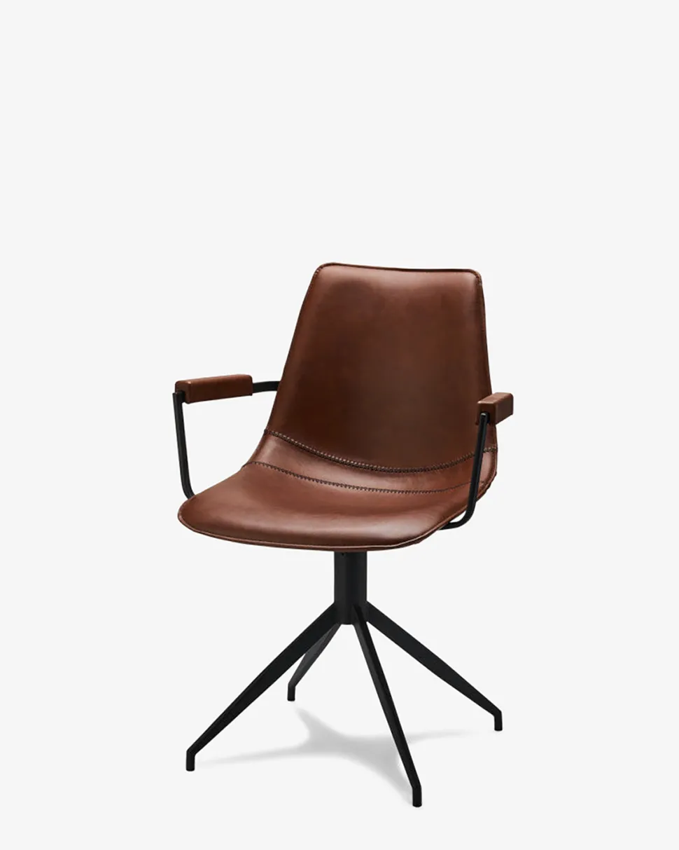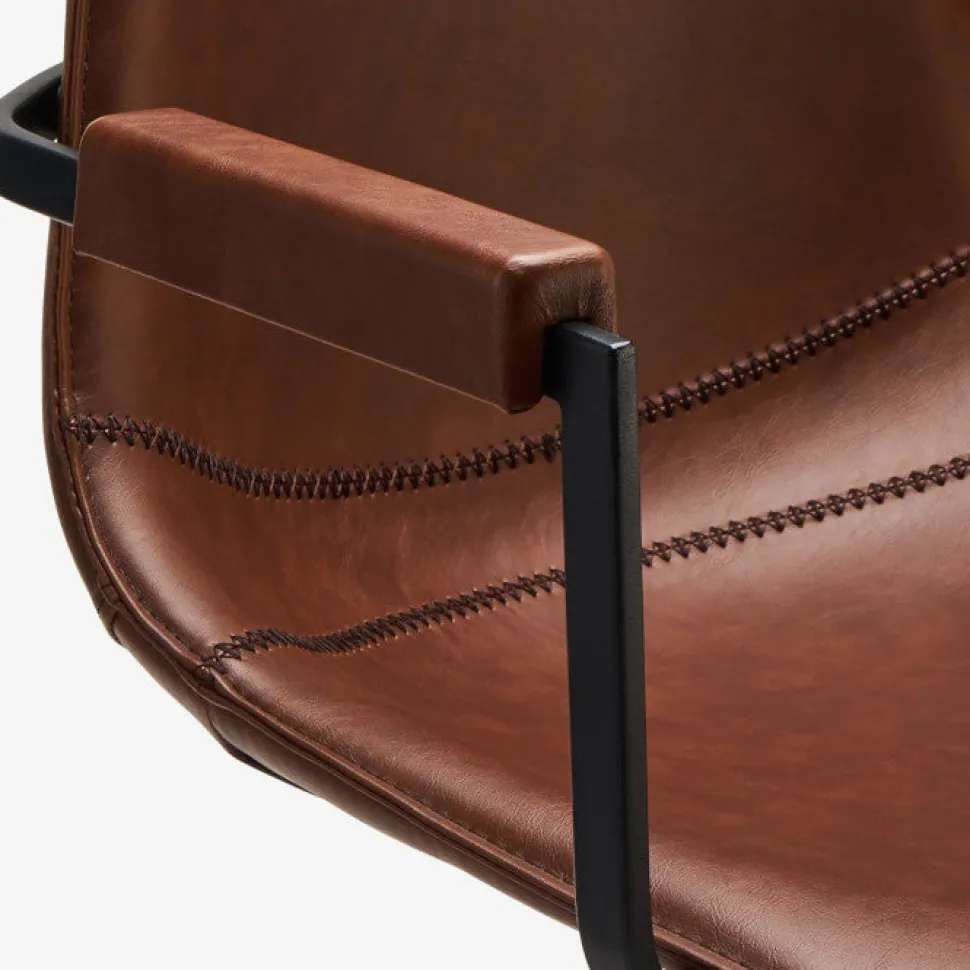 Flot og elegant spisebordsstol i cognac farvet læderlook. Stolen har armlæn så du sidder behageligt, og den er monteret med sorte metal ben.