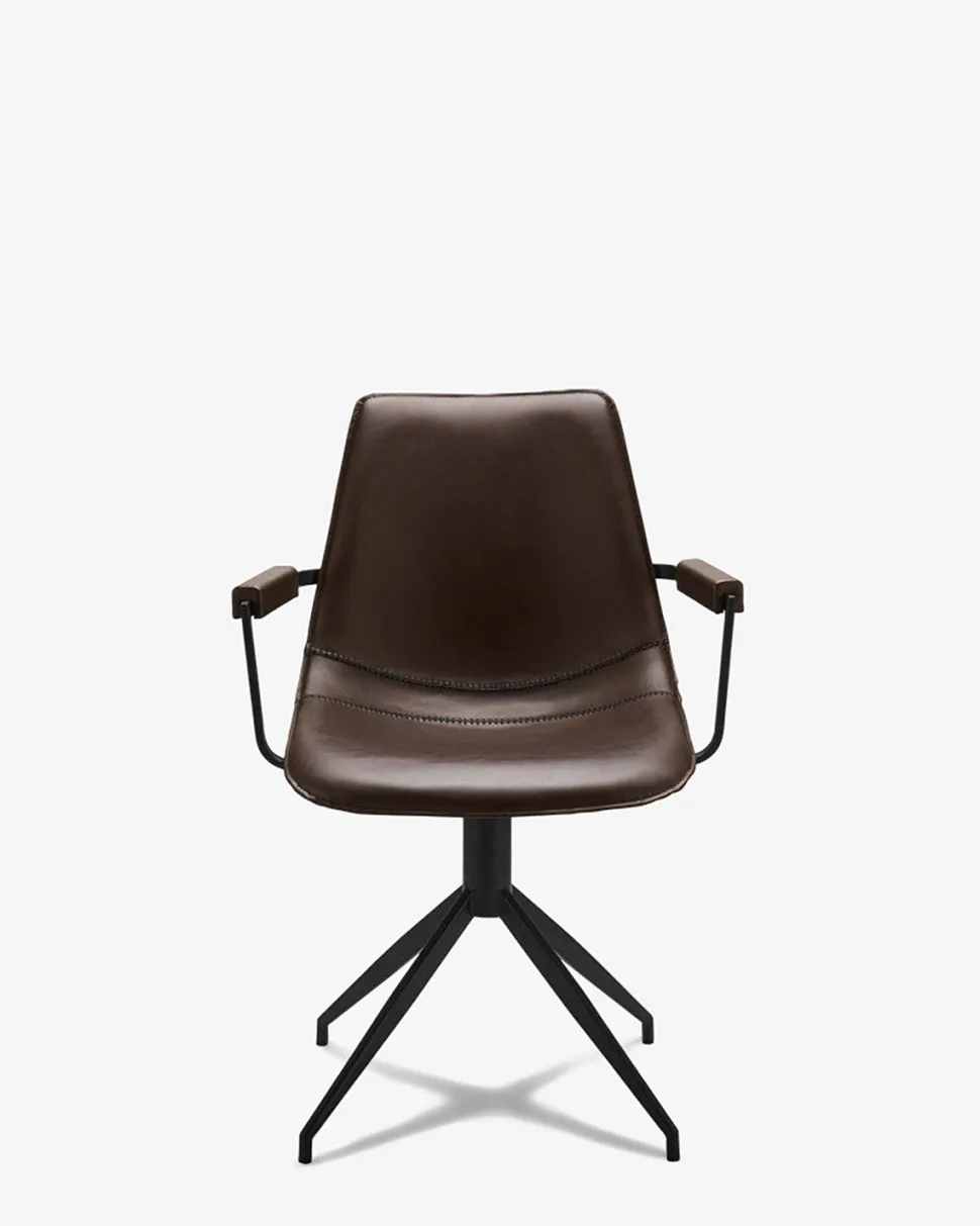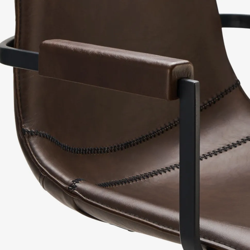 Flot og elegant spisebordsstol i mørkebrun læderlook. Stolen har armlæn så du sidder behageligt, og den er monteret med sorte metal ben.