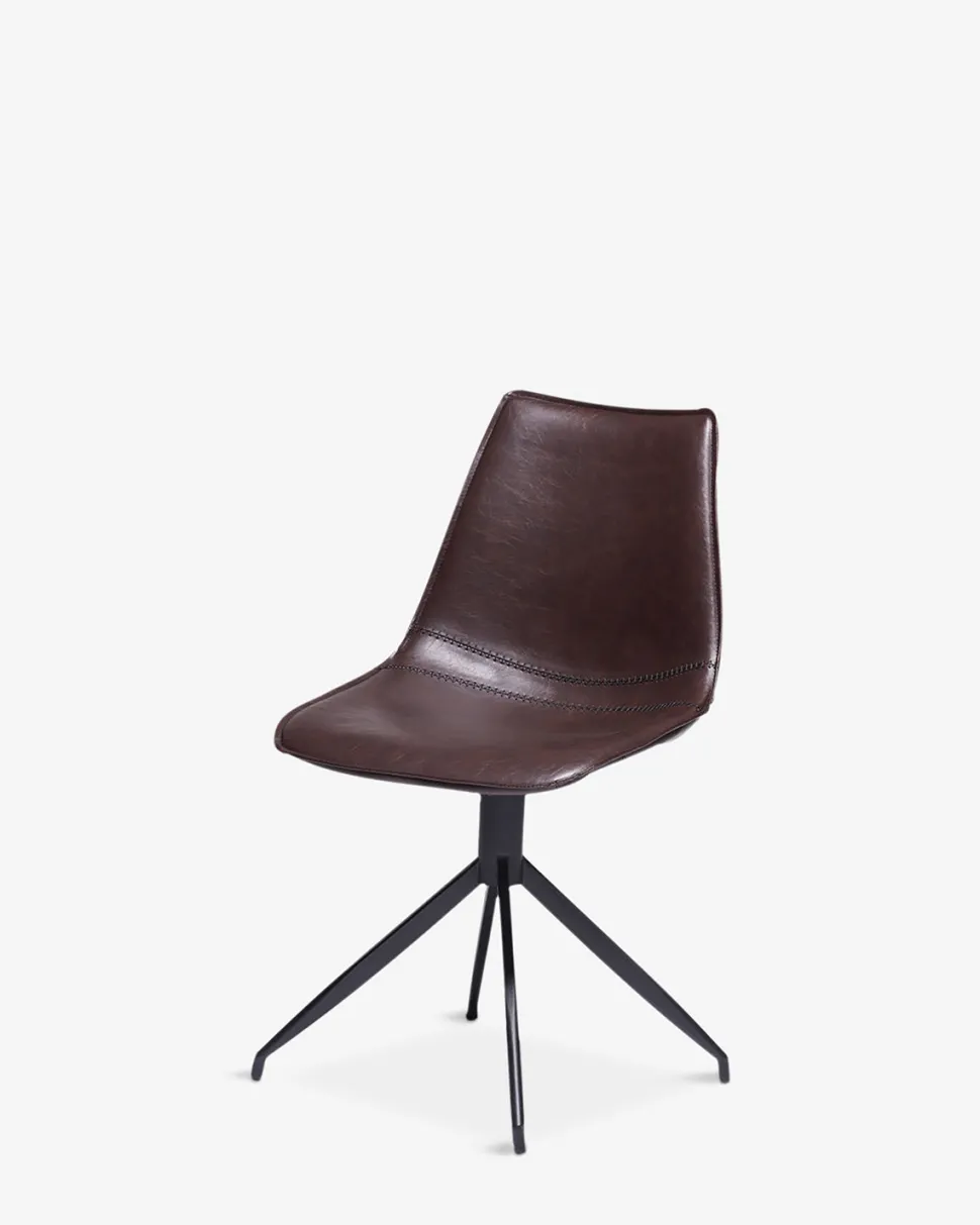 Flot og enkel spisebordsstol i mørkebrun læderlook, monteret med sorte metal ben.