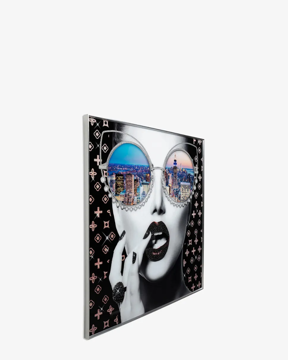 Det store Glasvægbillede bruger New York Citys skylines som baggrund for et stilfuldt portræt af en model.