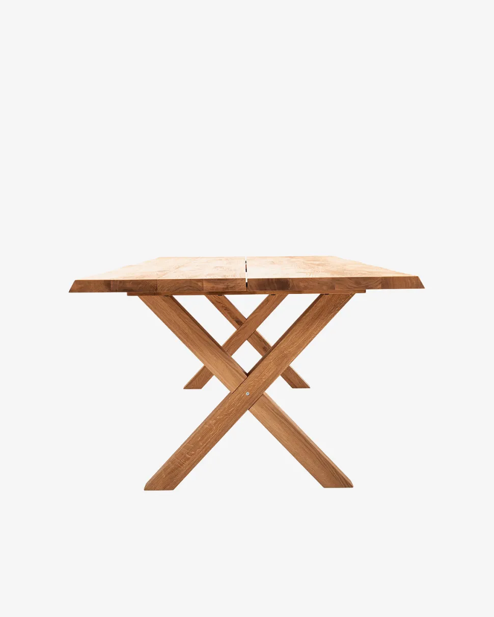 Nordica spisebordet er et kraftfuldt og holdbart møbel, udført i massiv eg med natur olie, som fremhæver træets smukke struktur. Den buede kant og de markante X-formede ben giver bordet et robust udtryk med karakter og varme.