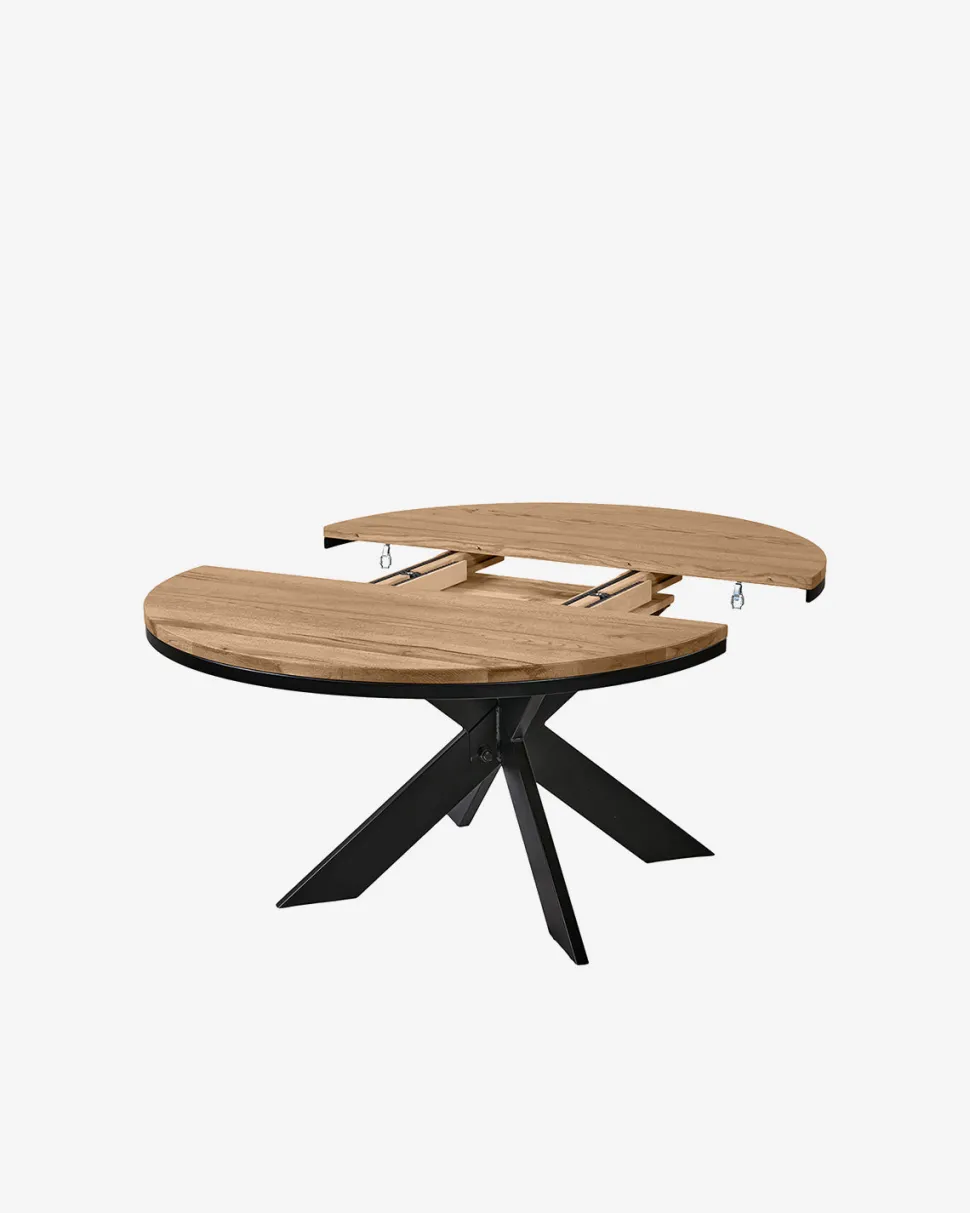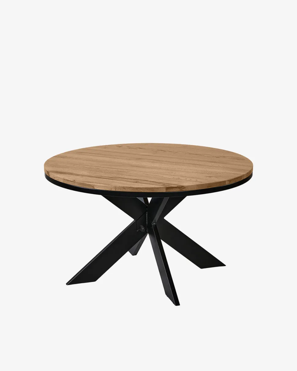 Bordet hviler på en kraftig sort metal stjernesokkel, som giver et let industrielt udtryk og samtidig sørger for stabilitet og god benplads omkring bordet. Med en diameter på Ø.130 cm fungerer bordet optimalt til både hverdagsmåltider og hyggelige gæstemiddage.