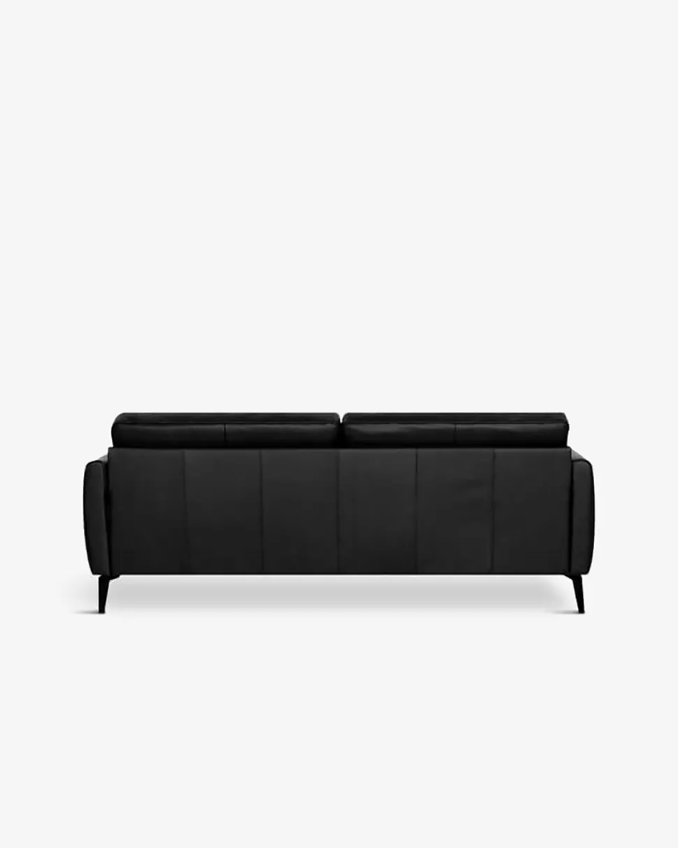 Sofaen er betrukket i sort slidstærk okselæder på alle slidflader og en split læder på siderne og ryggen.
