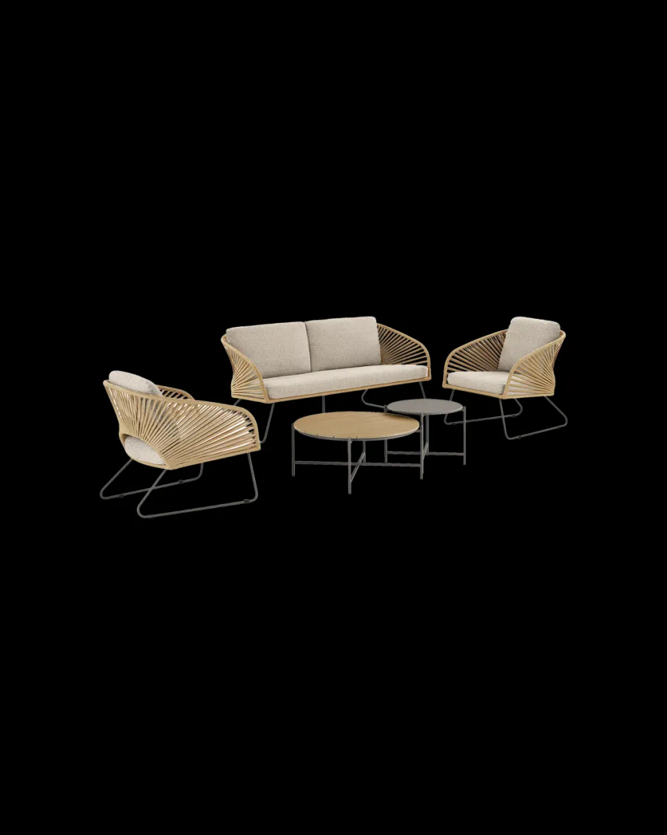 Novella loungesæt i sand med slankt stel og kraftig flet. Komplet loungegruppe med 2 borde og hurtigtørrende hynder.
