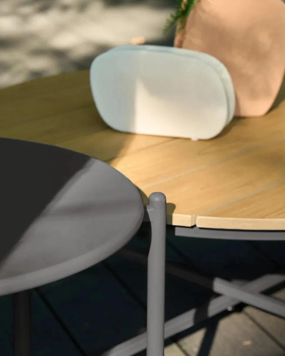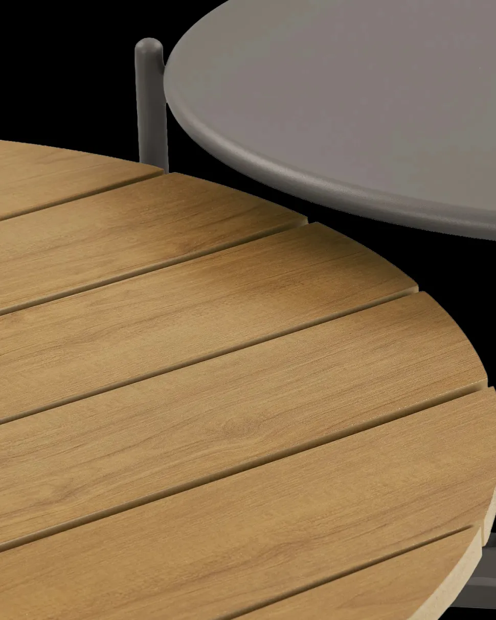 Det store sofabord har gråt stel og non-wood bordplade i eg-look, der tilfører varme og naturlig karakter. Det lille sofabord har gråt stel med matchende grå bordplade, hvilket giver et elegant og afbalanceret helhedsudtryk.