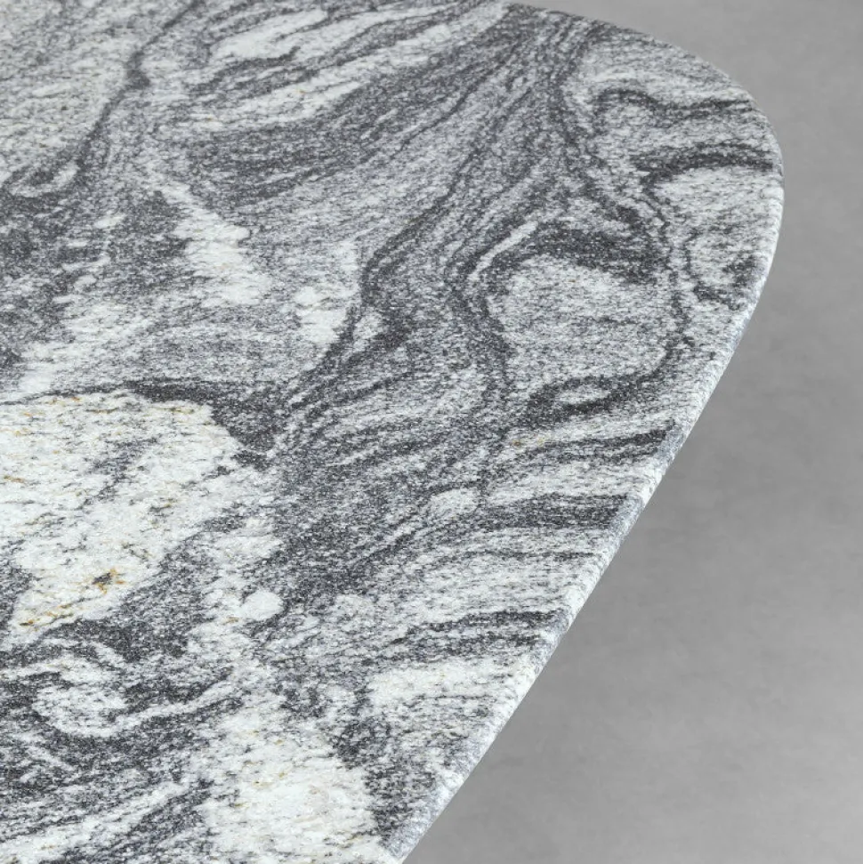 Granitbordpladen er meget hårdfør, og let at vedligeholde, og den flotte ovale facon og det særlige mønster på bordpladen, gør spisebordet til et godt bud på et nyt spisebord til hjemmet.