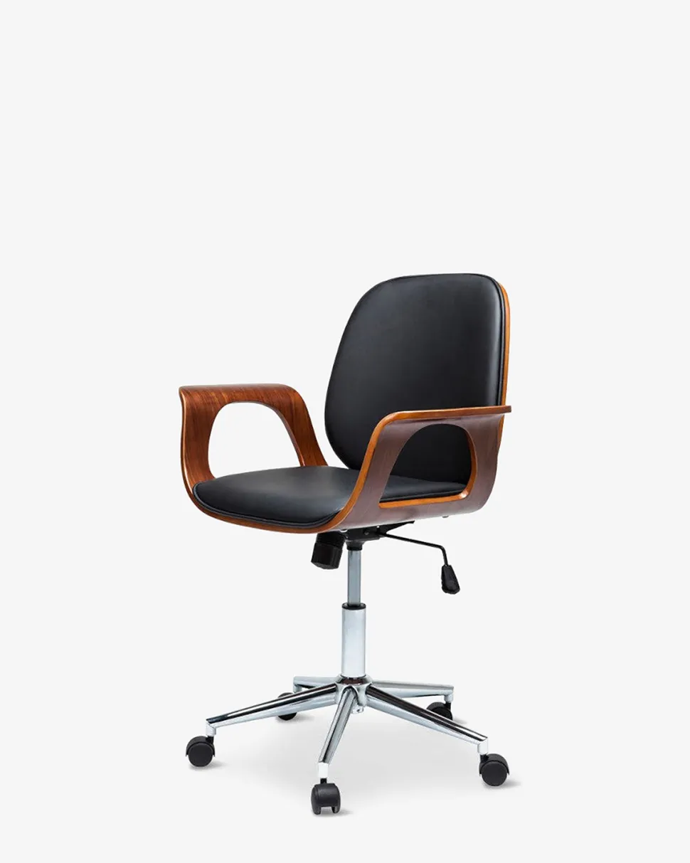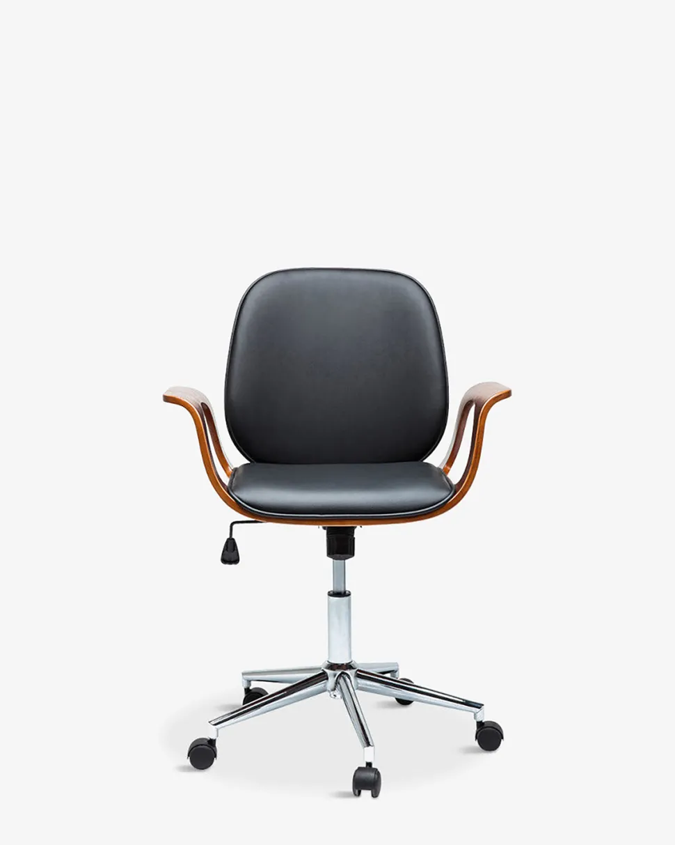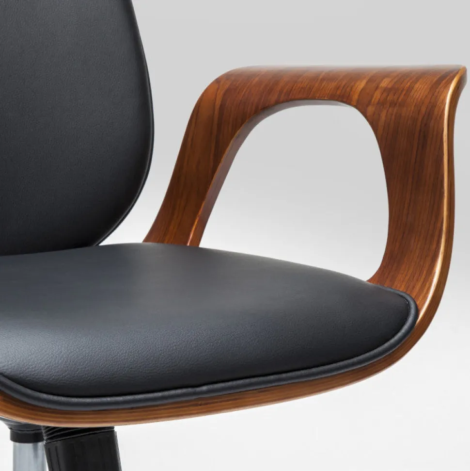 Her viser vi Patron kontorstol i valnød, som er en dejlig kontorstol med hjul. Stolen har armlæn, og en god pasform med sort læderlook.