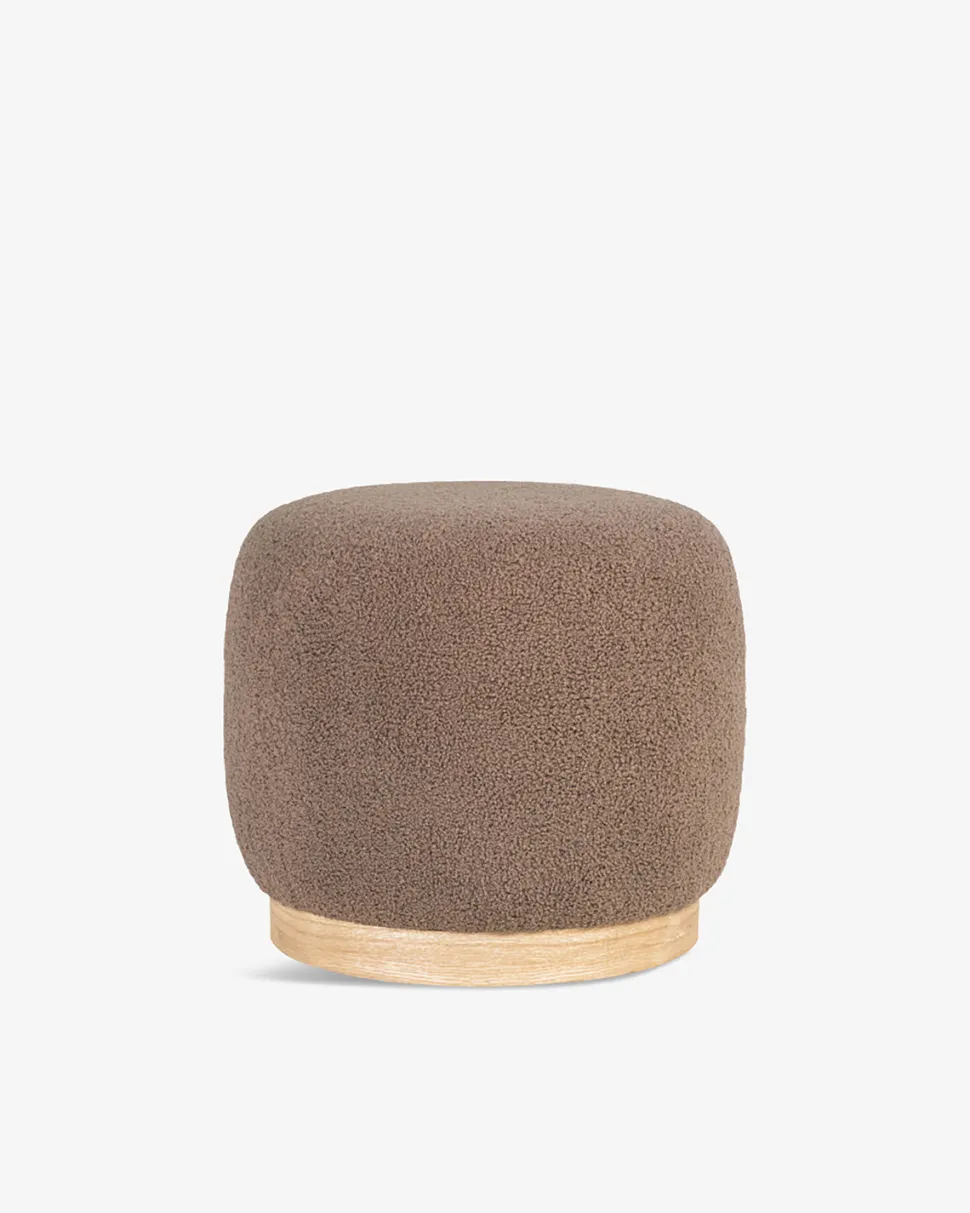 Fin og elegant rund puf med bløde former, betrukket med dejligt blødt bouclé stof. Ideel til at skabe hygge i hjemmet.
