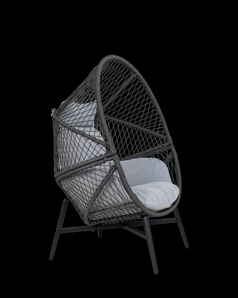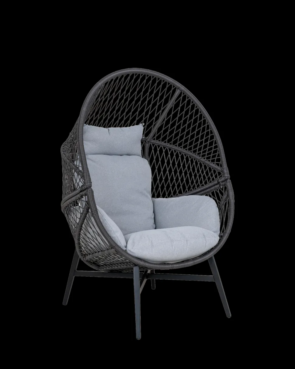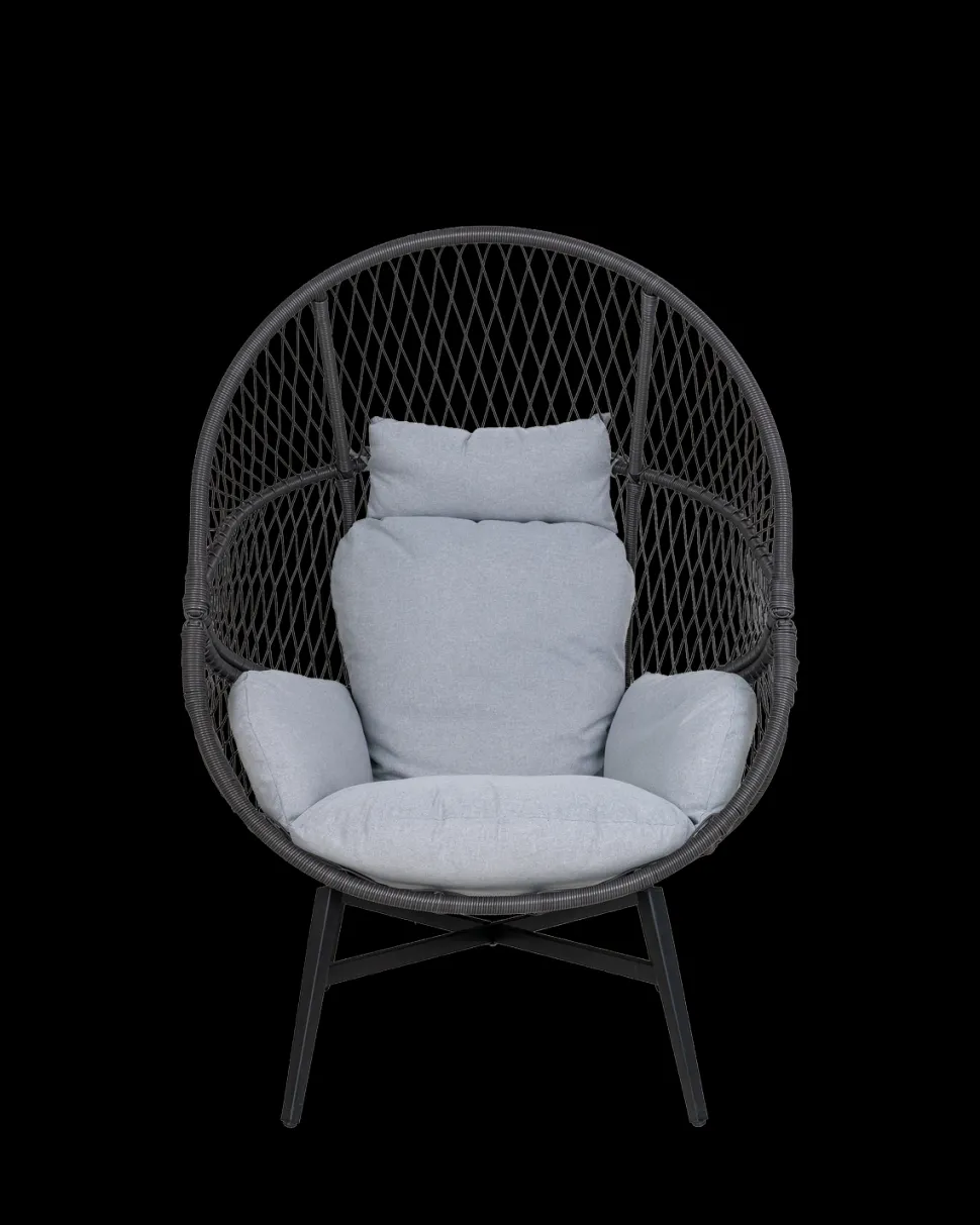 Rosario æggeformet loungestol i sort polyrattan med sort stel og grå hynder. Komfortabel loungestol med moderne design til terrasse eller have.