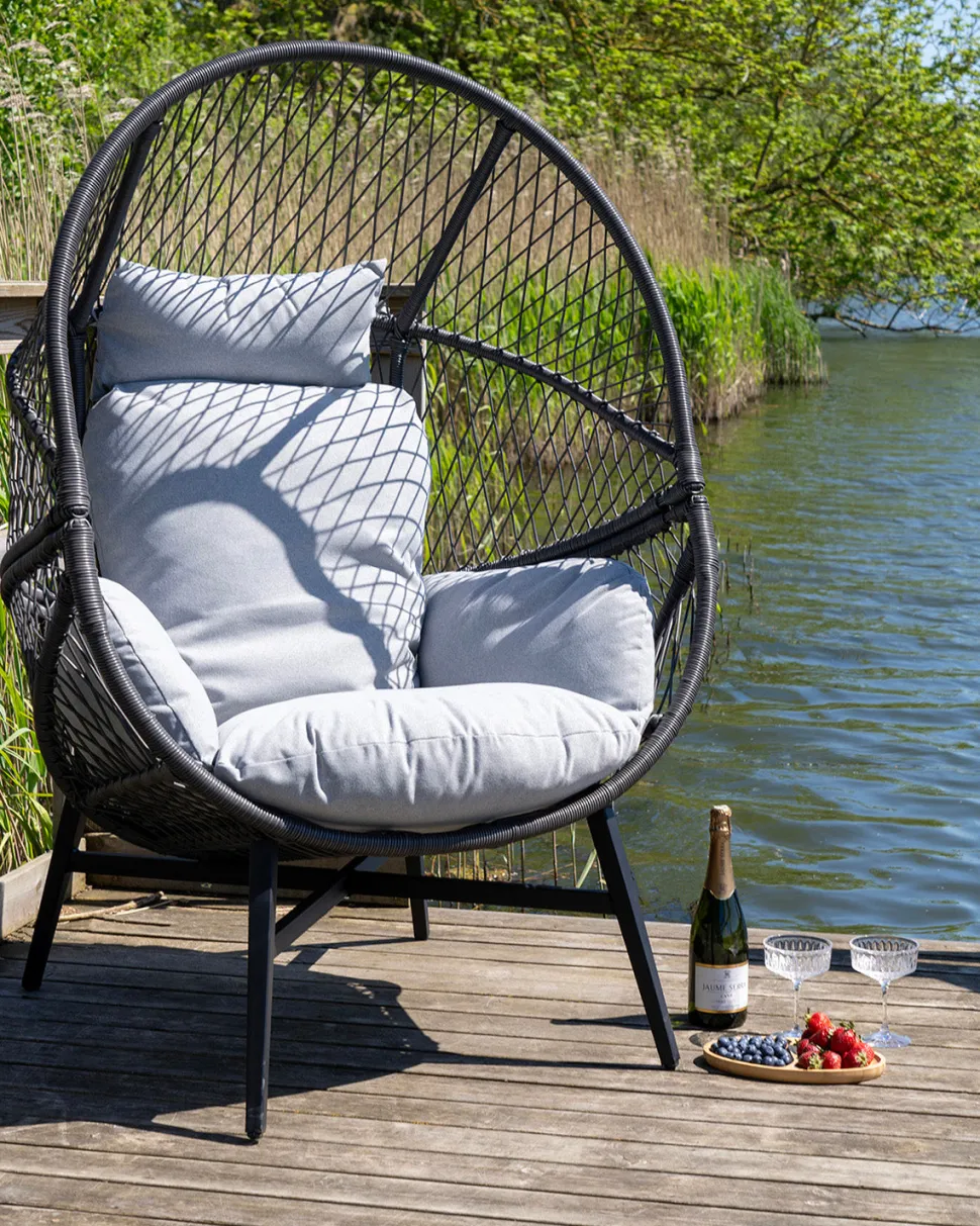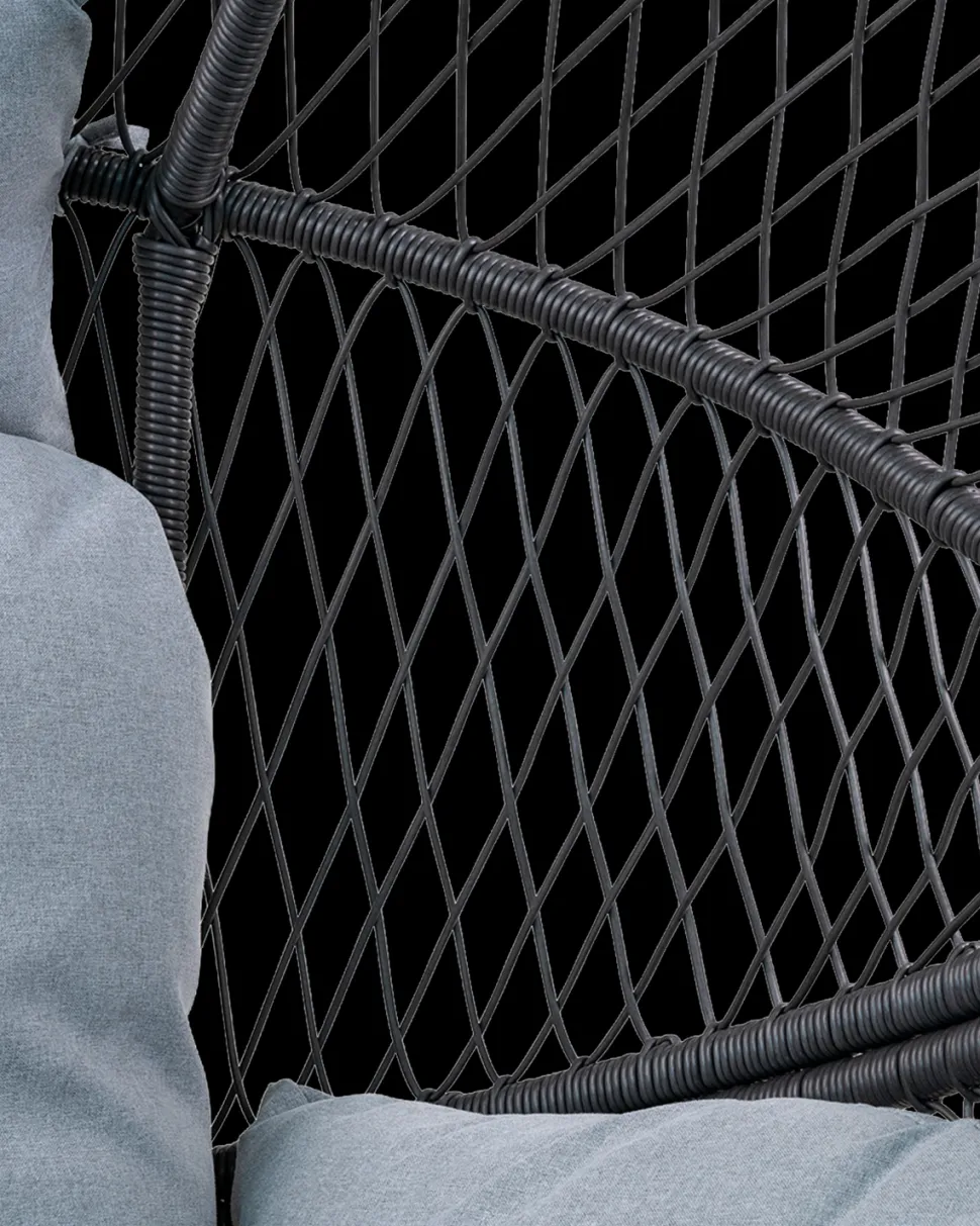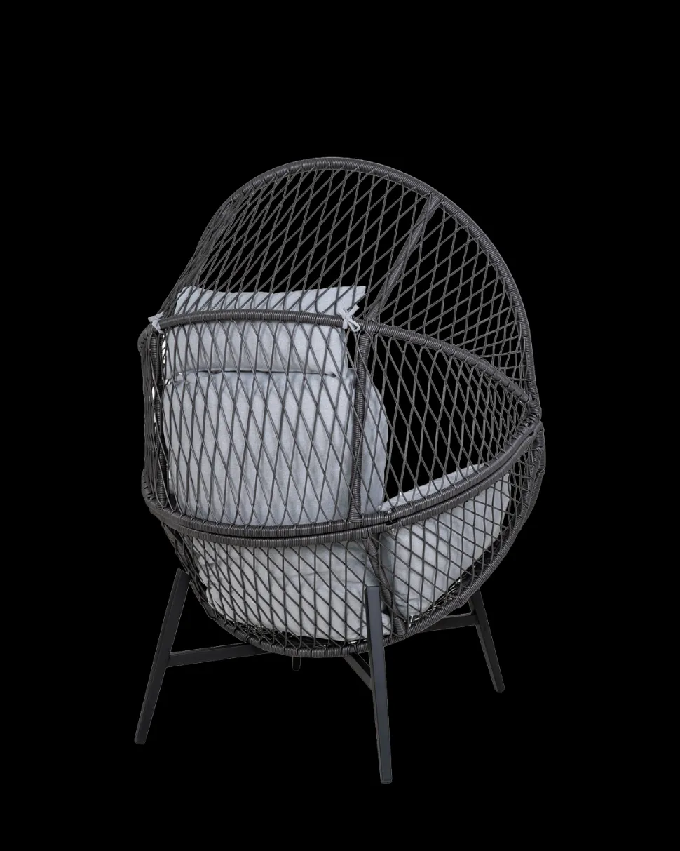 Rosario æggeformet loungestol i sort polyrattan med sort stel og grå hynder. Komfortabel loungestol med moderne design til terrasse eller have.