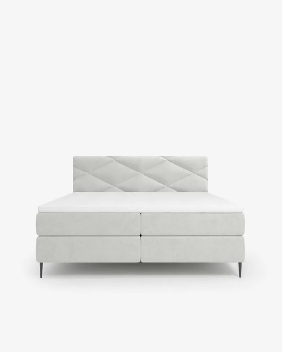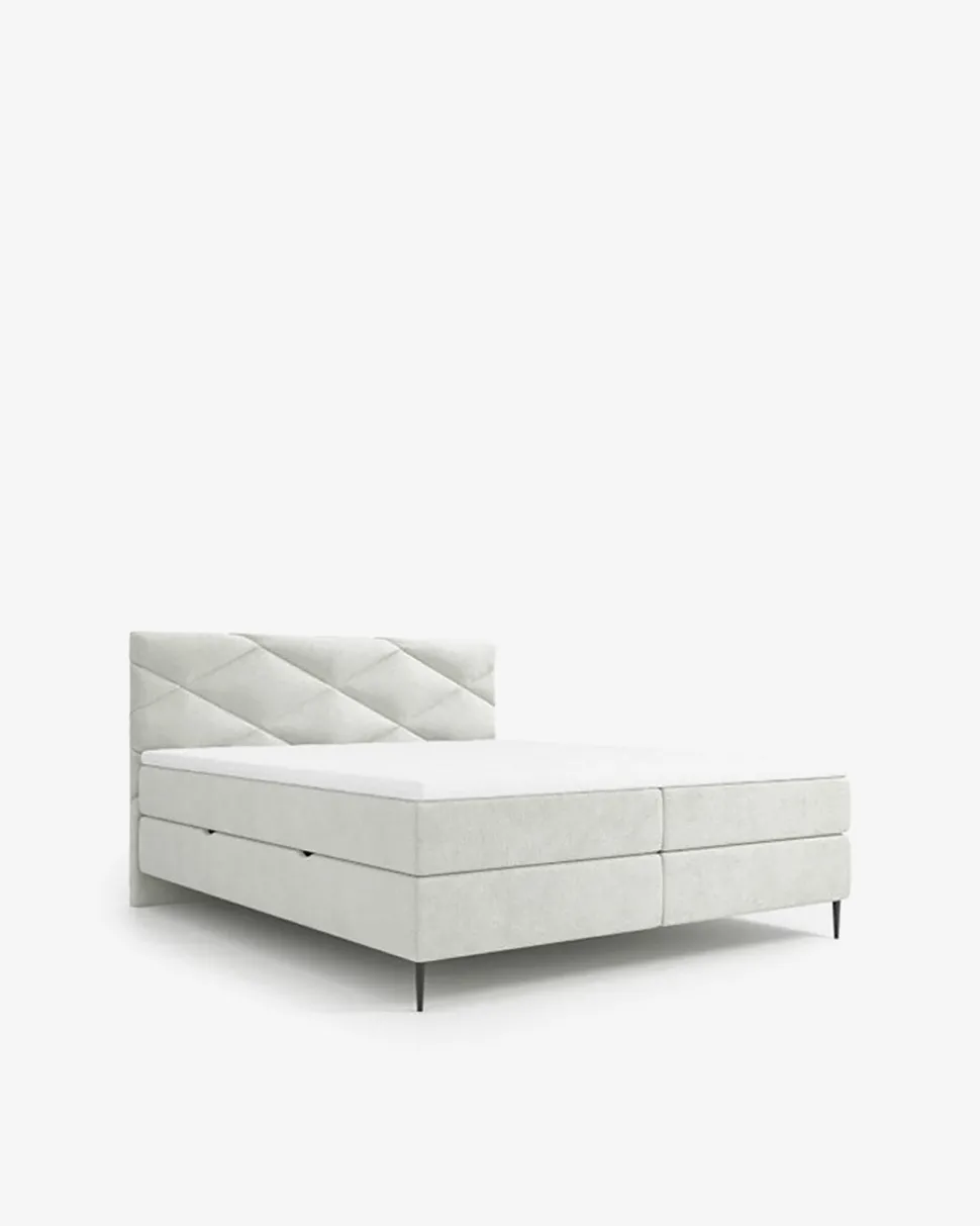 Sengens elegante design fremhæves af en hovedgavl med diamantformede syninger, og de 15 cm høje ben tilføjer lethed til hele strukturen.