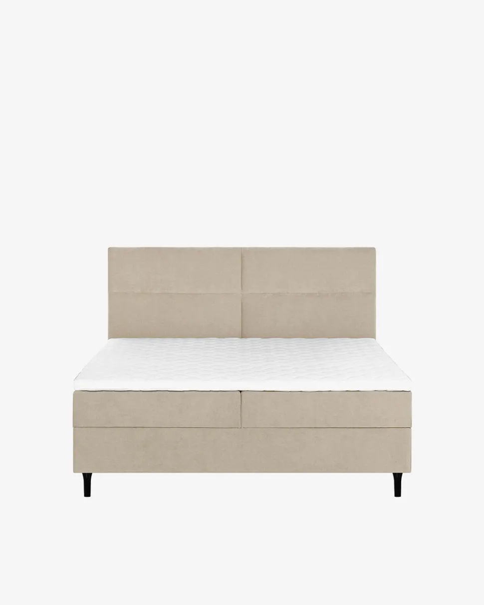 Serano magasinseng – komfort og opbevaring i ét. Magasinseng i Maloy Dove beige med 7-zonet pocket, opbevaring under madrasserne og inkl. hovedgavl.