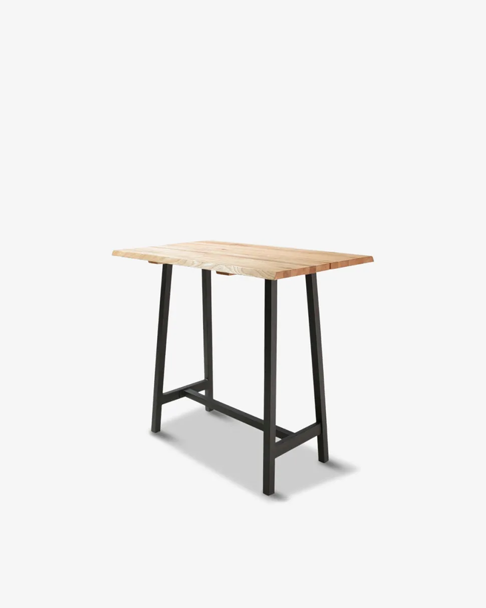 Barbord med bordplade i smukt rustik design, med to planker i massiv eg. Bordpladen er udført i natur olieret europæisk eg med natur kant. Stellet er lavet af sortlakeret metal. Knaster og revner kan være kittet. Dette gøres for at give en glat overflade og beholde det rå look. Et træmøbel kræver regelmæssig pleje for at holde en afvisende overflade og sikre det mod udtørring eller falmning. De fleste træmøbler er fra producentens side forbehandlet enten med olie eller sæbe, men vi anbefaler at du sikrer dig, træet er mættet inden brug.
