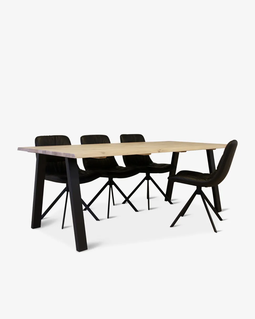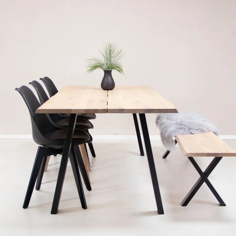 Plankebord med bordplade i smukt rustik design, med to planker i massiv eg. Bordpladen er udført i hvid olieret europæisk eg med natur kant. Stellet er lavet af sortlakeret metal.