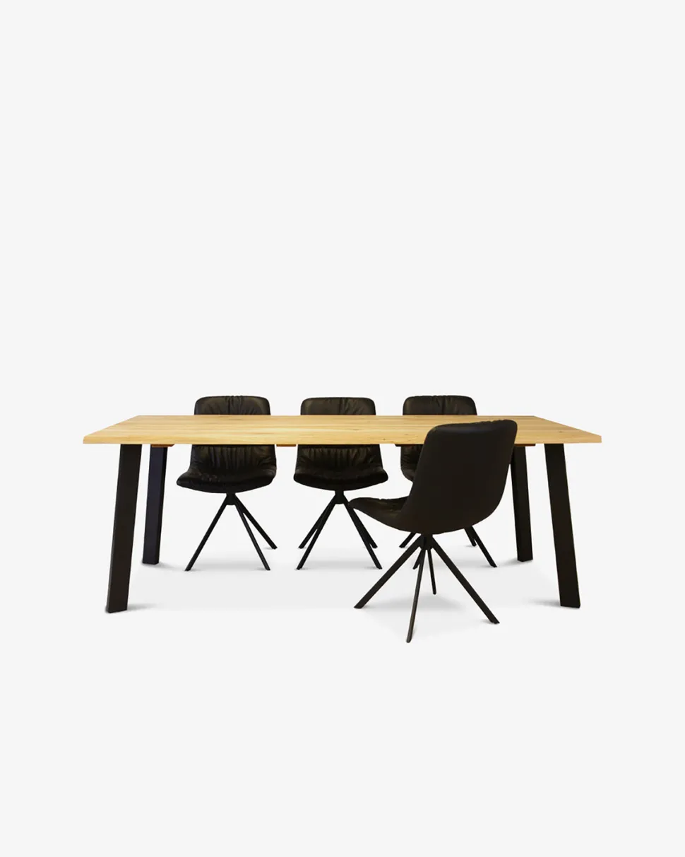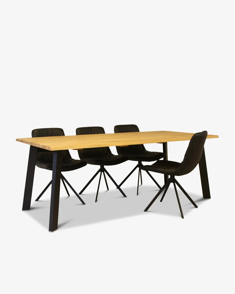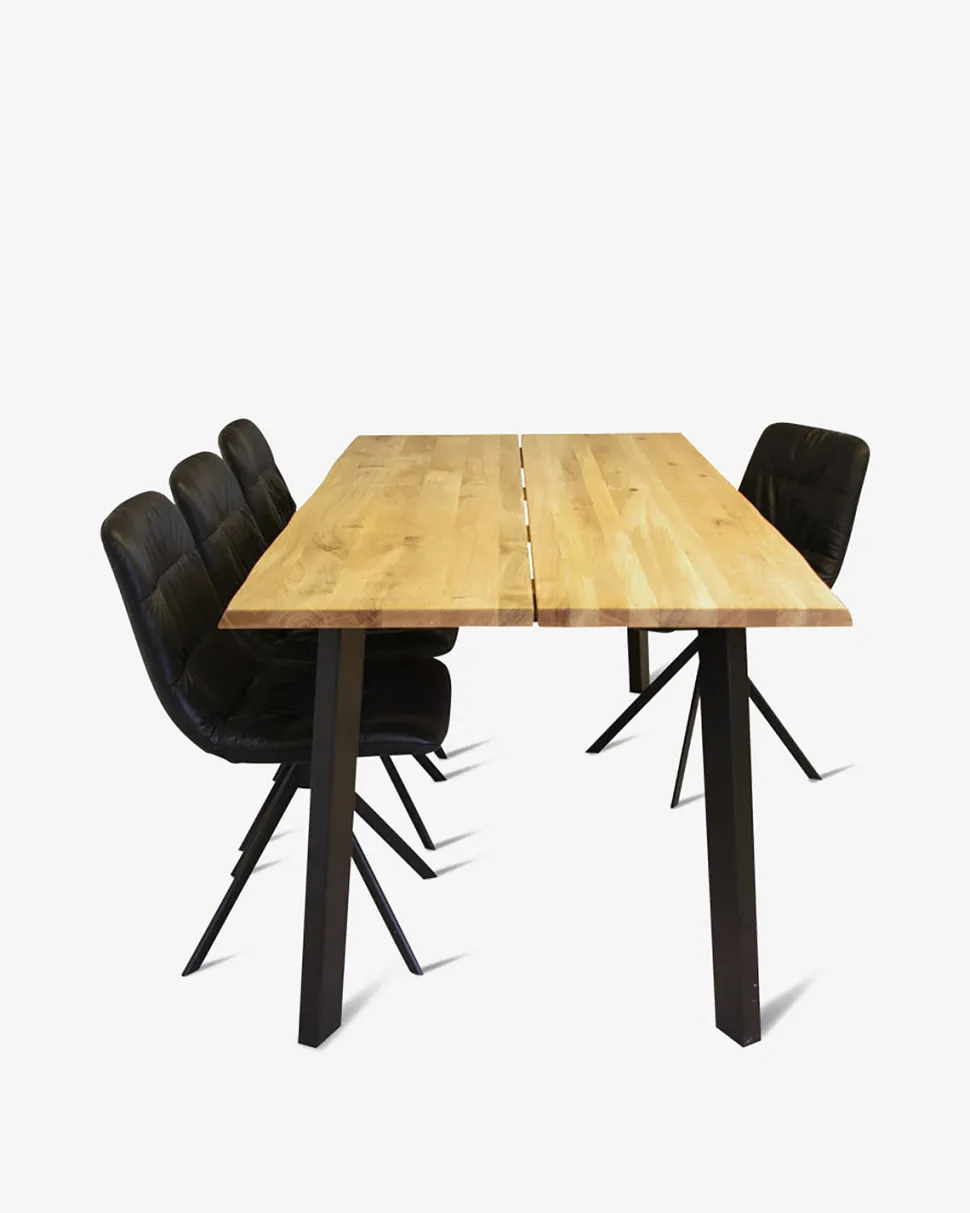Plankebord med bordplade i smukt rustik design, med to planker i massiv eg. Bordpladen er udført i europæisk naturolie eg med natur kant. Stellet er lavet af sortlakeret metal.