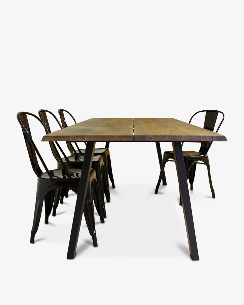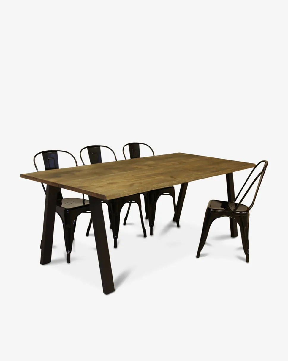 Bordpladen er udført i europæisk smoked eg med naturkant. Stellet er udført i sortlakeret metal. Knaster og revner kan være kittet. Dette gøres for at give en glat overflade og beholde det rå look.