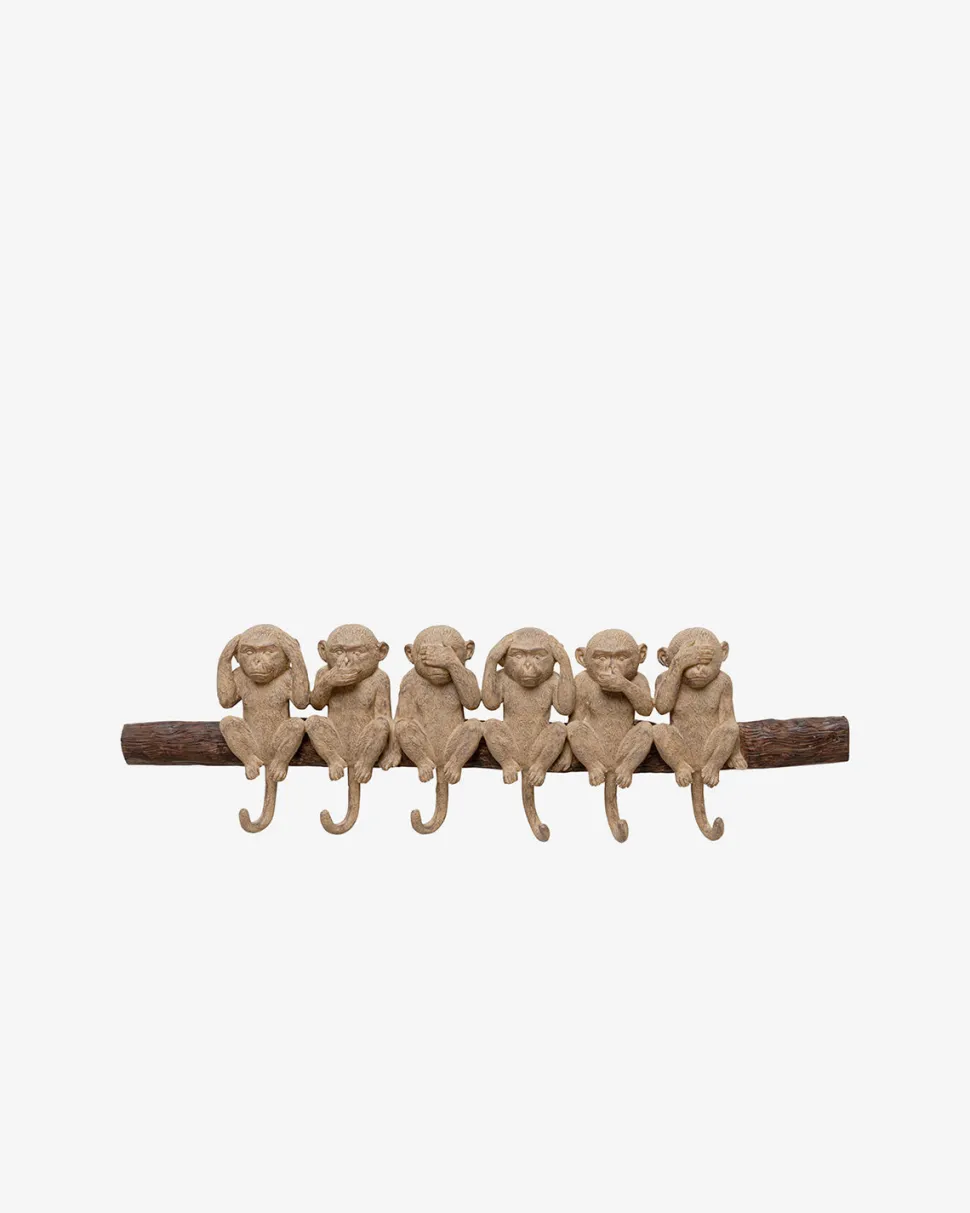 Six Monkeys knagerækken kombinerer praktisk opbevaring med et legende og dekorativt design. De seks aber er udført i lys brun og formet, så deres snoede haler fungerer som knager – en finurlig detalje, der giver både funktion og personlighed til væggen.