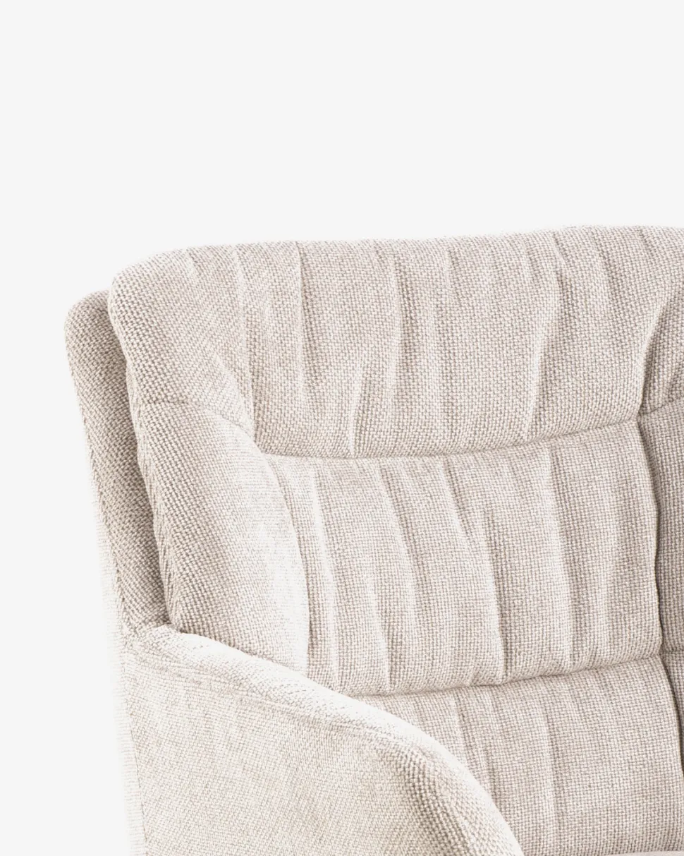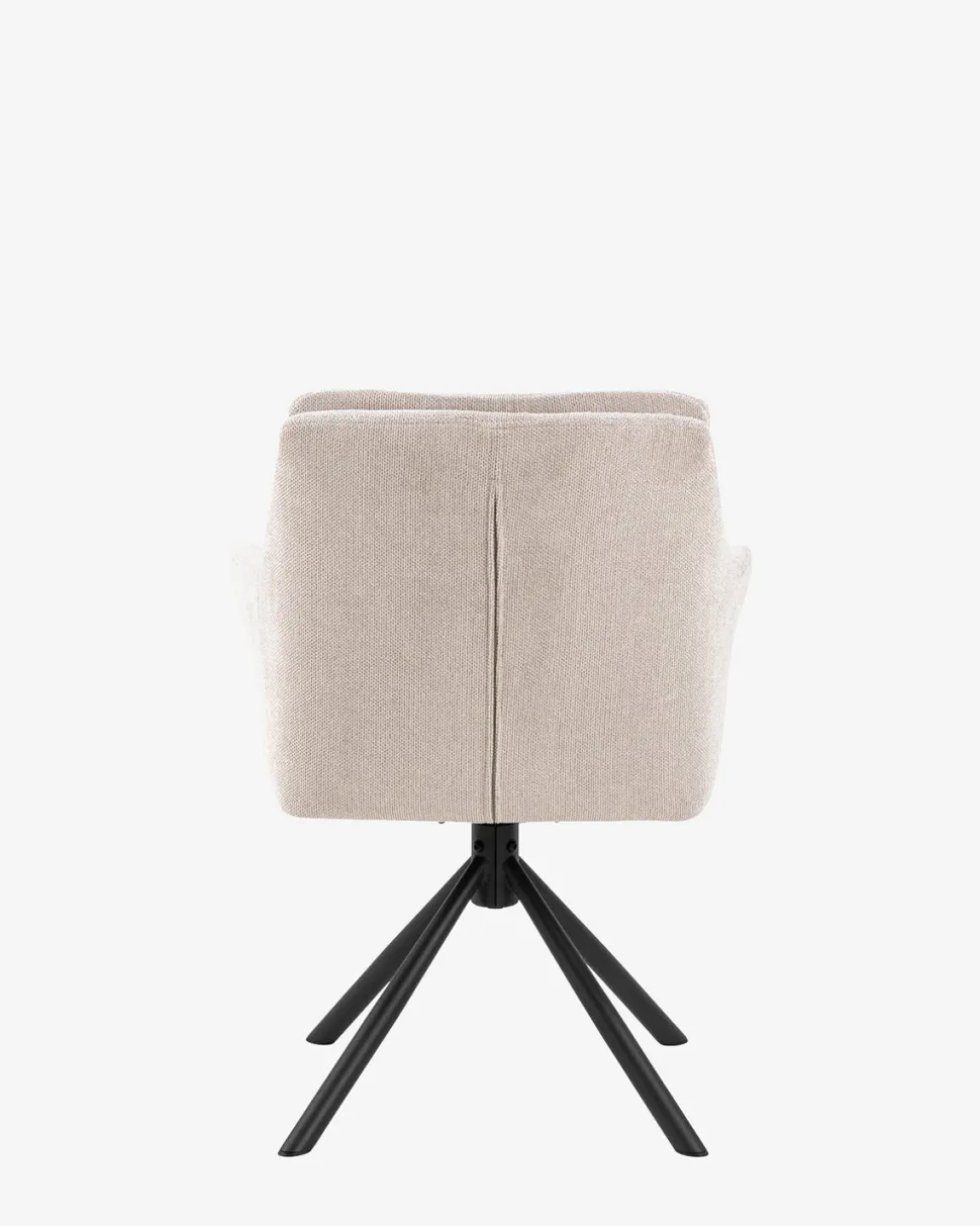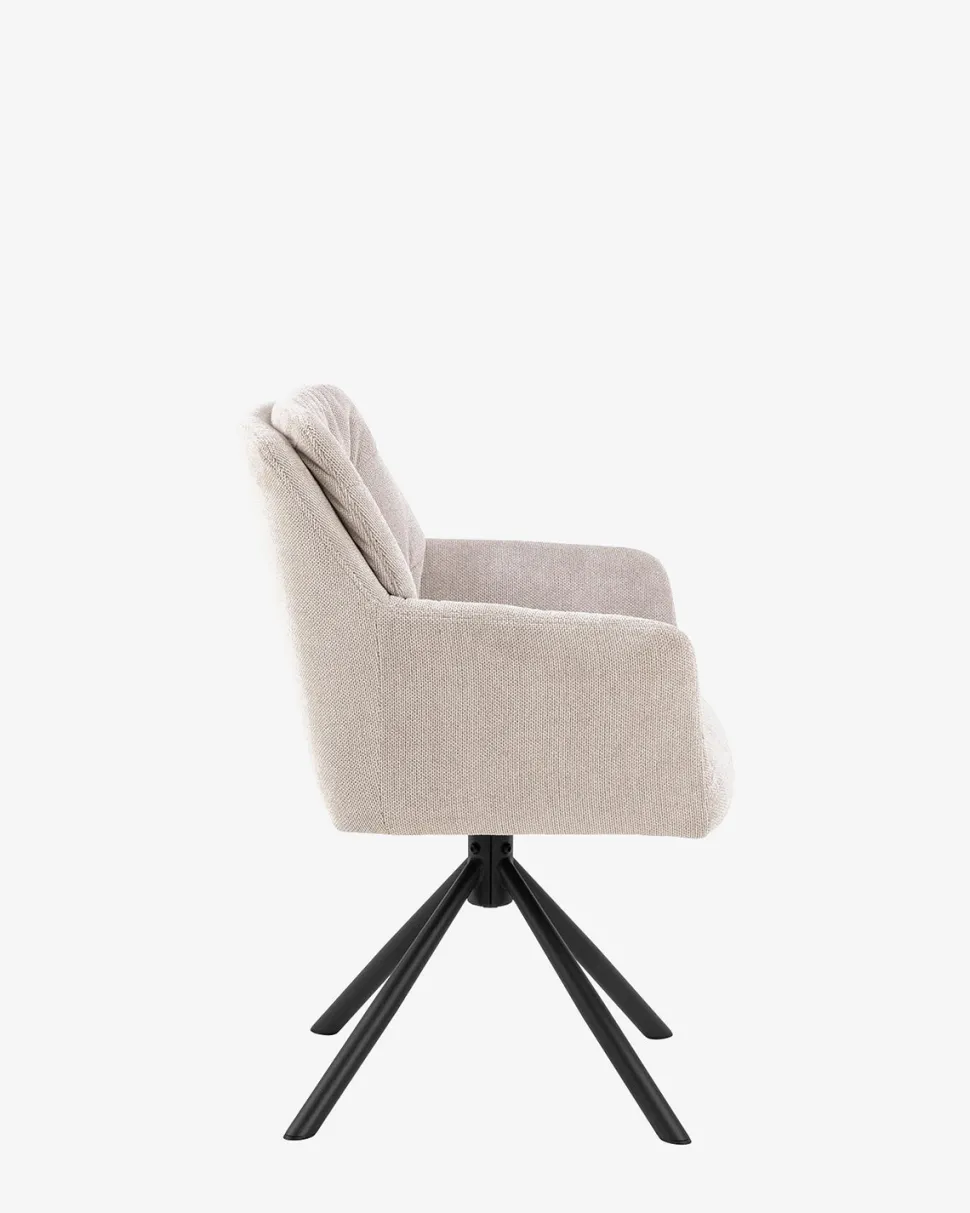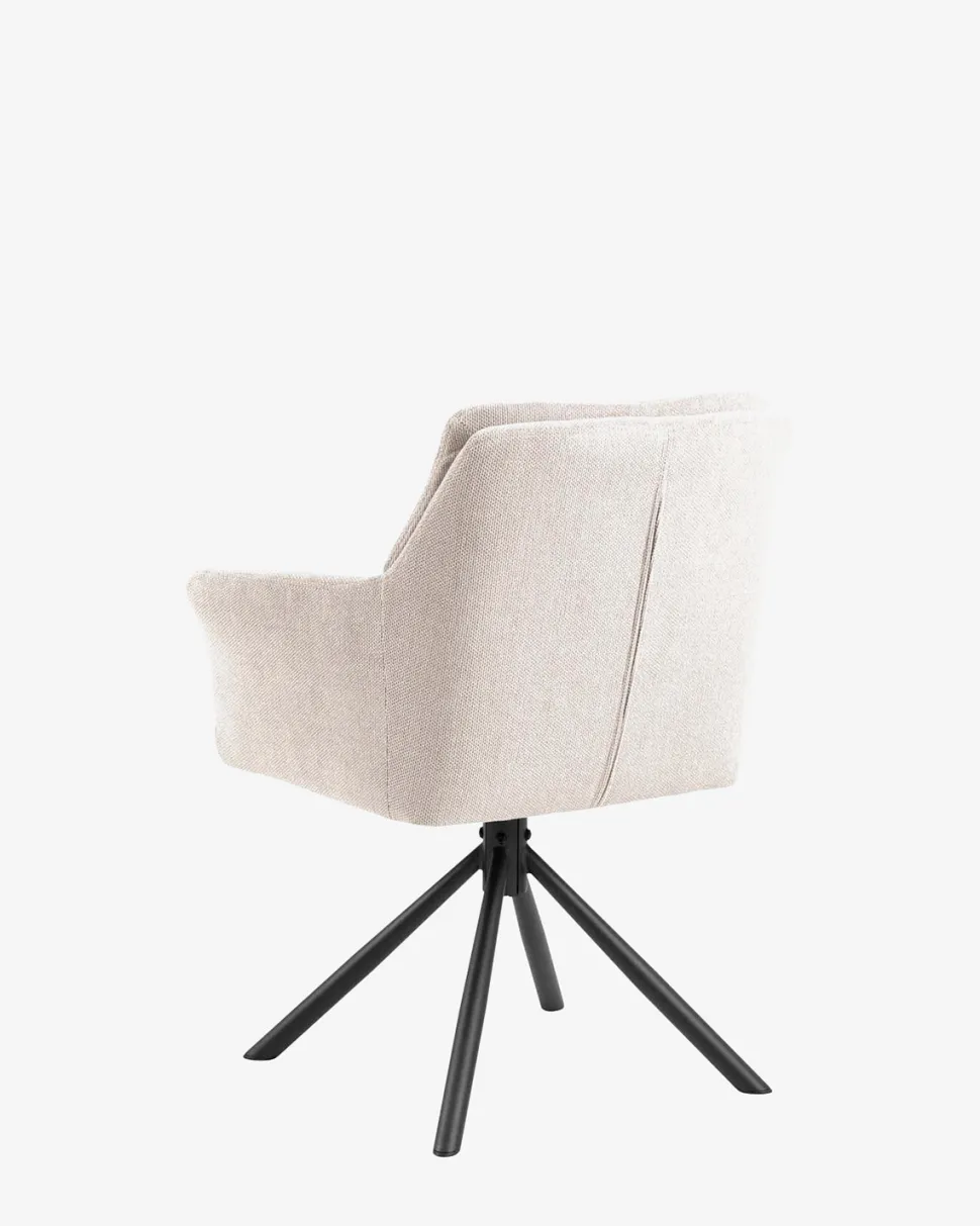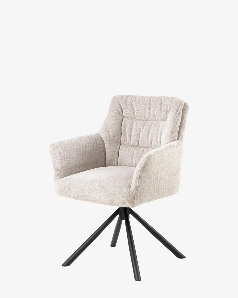 Sorto spisebordsstolen kombinerer stilrent design med høj siddekomfort. Stolen er betrukket med et blødt beige stof, der tilfører varme og et moderne udtryk til dit spiseområde. Armlænet giver ekstra støtte, mens det sorte drejestel tilføjer både funktionalitet og et elegant, udtryk.