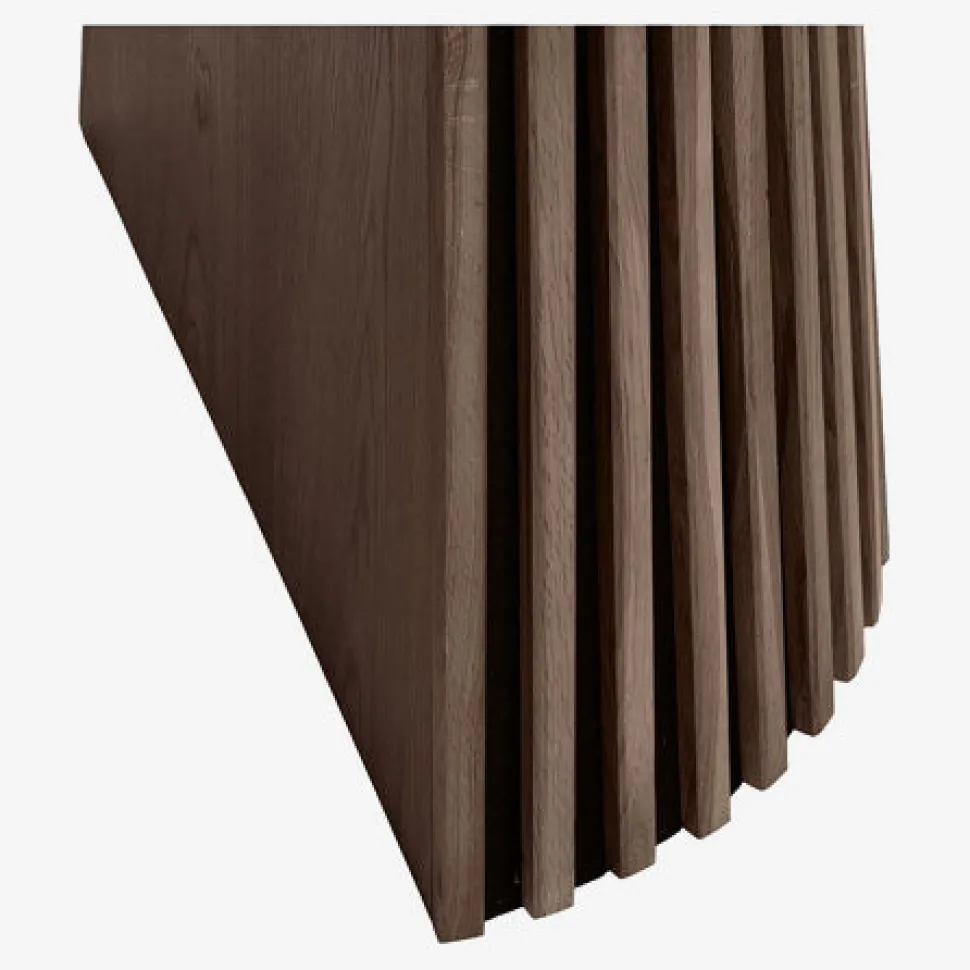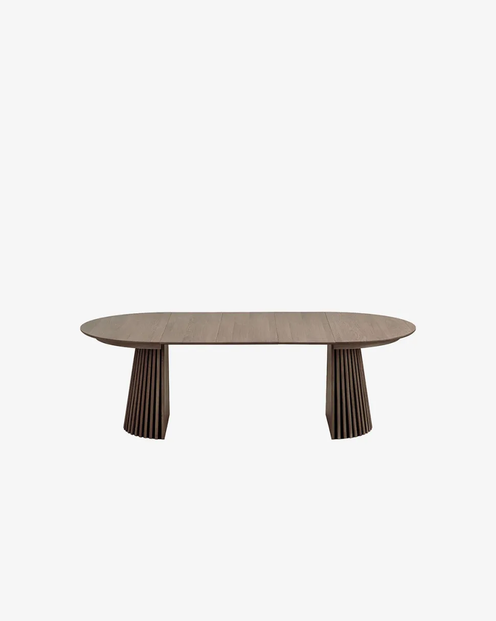 Den karakteristiske centersokkel med lodrette lameller sikrer stabilitet og god benplads, samtidig med at den tilføjer et elegant og moderne udtryk.