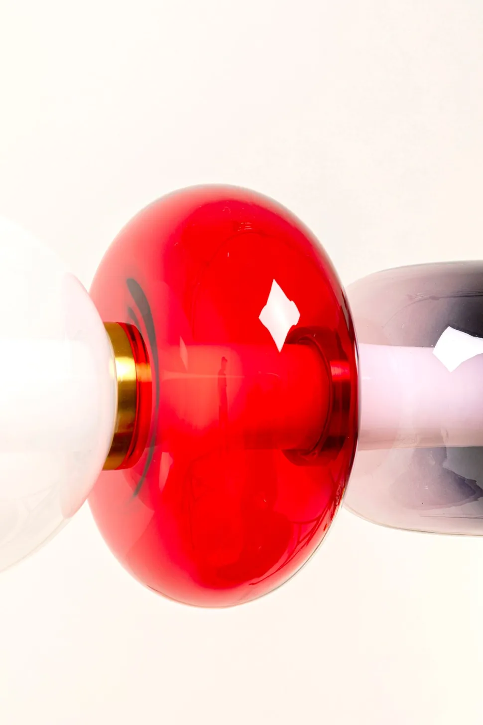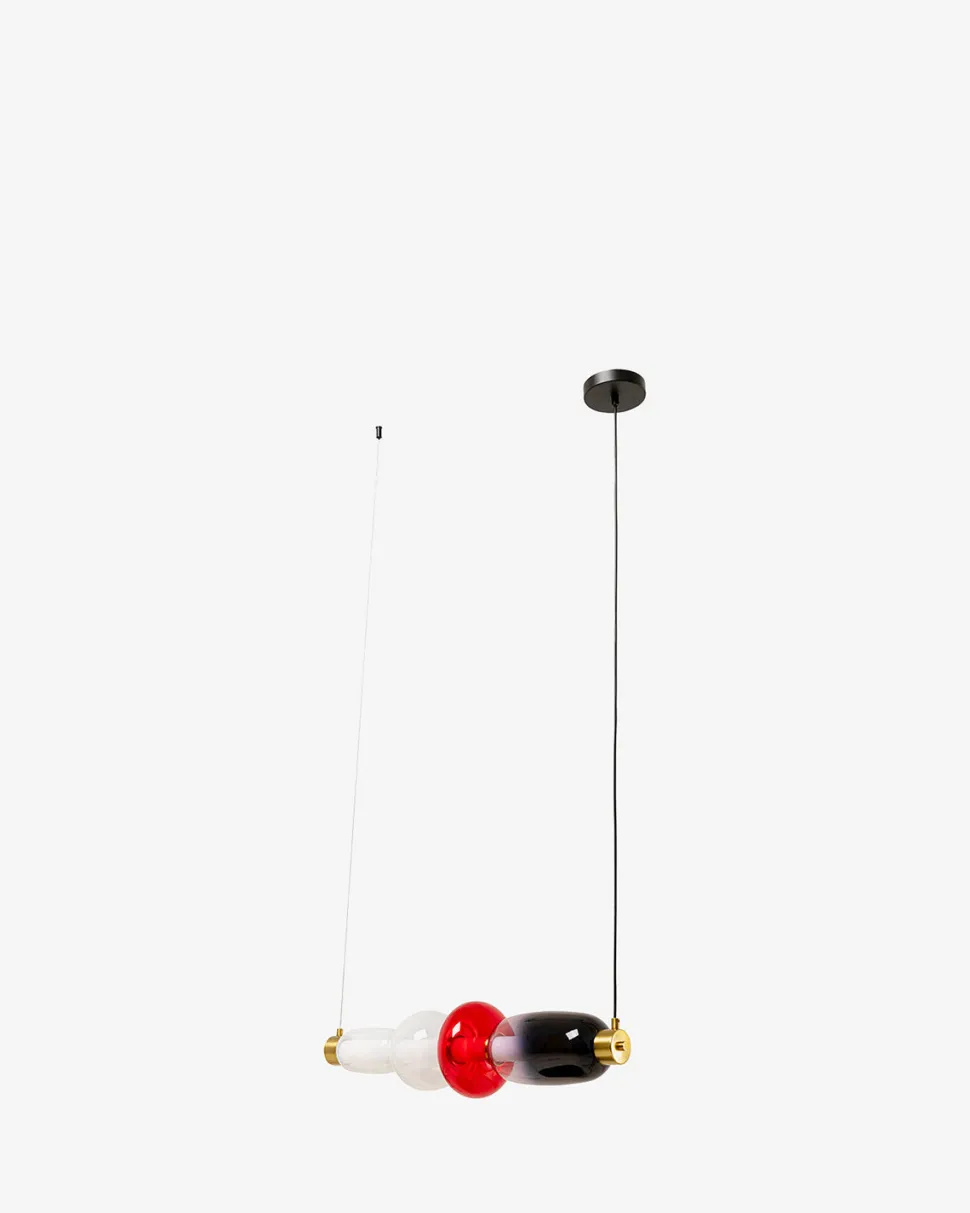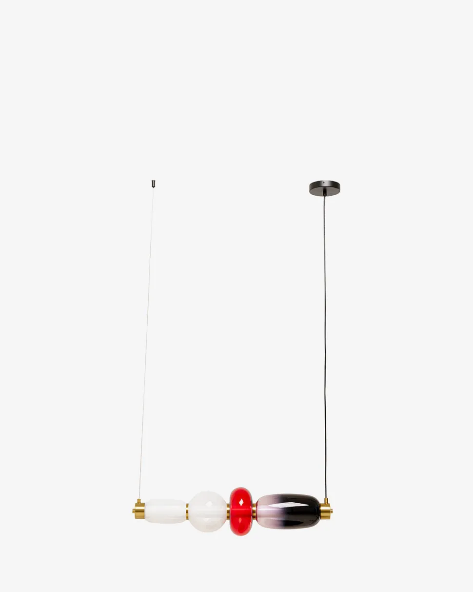 Sugar pendlen er et dekorativt og karakterfuldt valg til spisebord, køkkenø eller entré. De fire farvede glasskærme i sort, rød og hvid skaber et dynamisk og legende udtryk, mens messingdetaljerne tilfører et eksklusivt twist.
