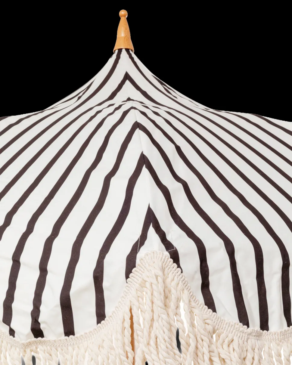 Temple Stripes parasol – klassisk stribet blikfang til uderummet. sort/hvid stribet med frynsekant. Elegant parasol med bøgetræsmast og tilt-funktion. Ø.200 cm.