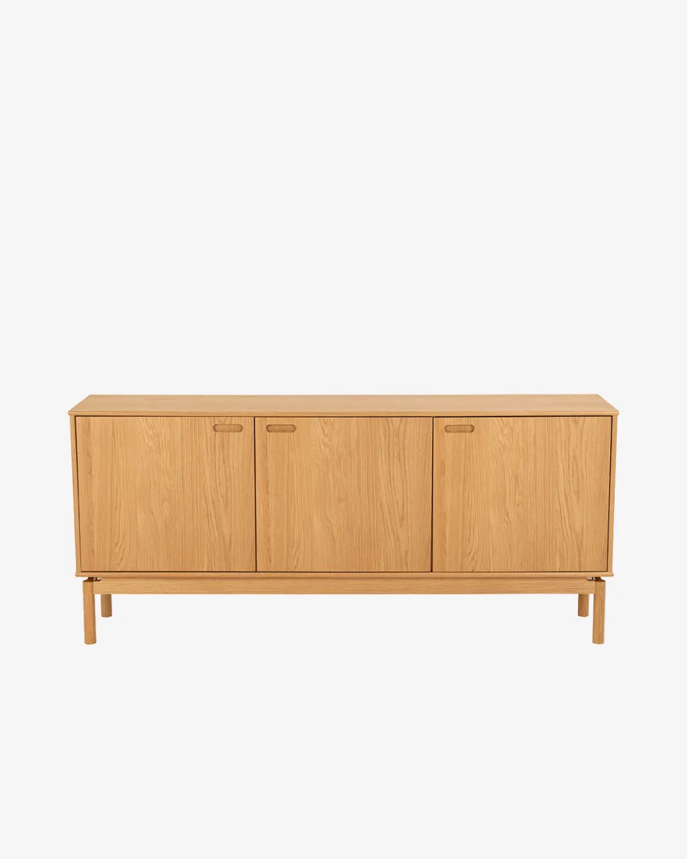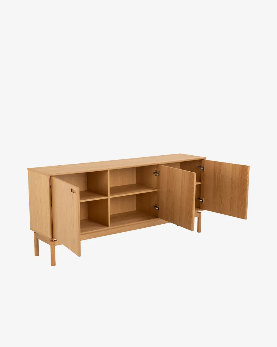 Tucson skænk – let design i eg finer med praktisk opbevaring. Skænk med 3 låger og hylde bag hver for god og diskret opbevaring.