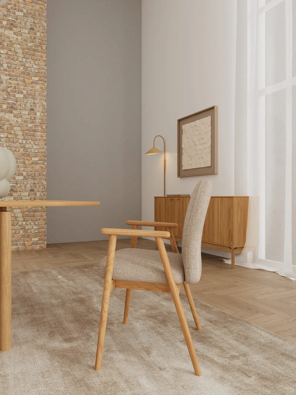 Tucson spisebordet kombinerer et let og moderne udtryk med praktisk funktionalitet. Bordpladen er udført i eg finer og hviler på et elegant stel, der giver et luftigt look omkring spisepladsen.