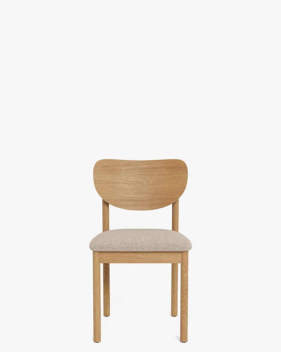 Tucson spisebordsstolen med træryg er en stilren og tidløs stol, der passer perfekt ind i Tucson-seriens varme og nordiske univers. Stolen har et stel i eg, som giver et naturligt og roligt udtryk, mens det polstrede sæde i sandfarvet stof sikrer en behagelig siddekomfort.