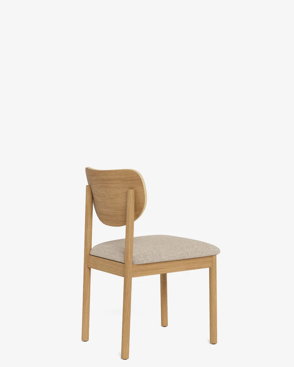 Tucson spisebordsstol med træryg og polstret sæde. Nordisk stol i eg med sandfarvet stof.