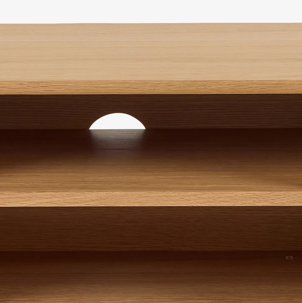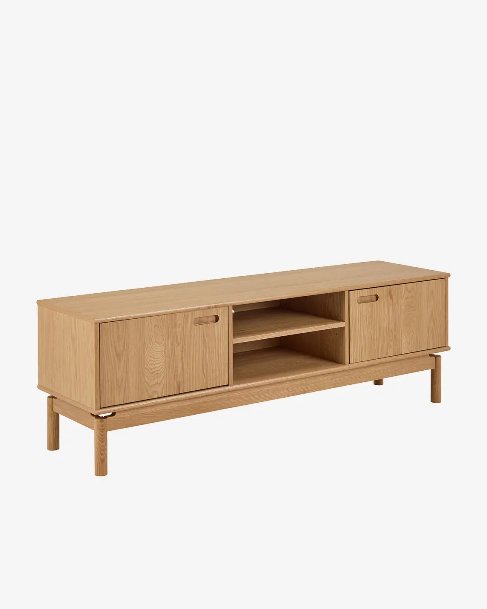 Tucson TV-bord – let design i eg finer med praktisk opbevaring. TV-bord med 2 låger og åbent rum med hylde i midten.