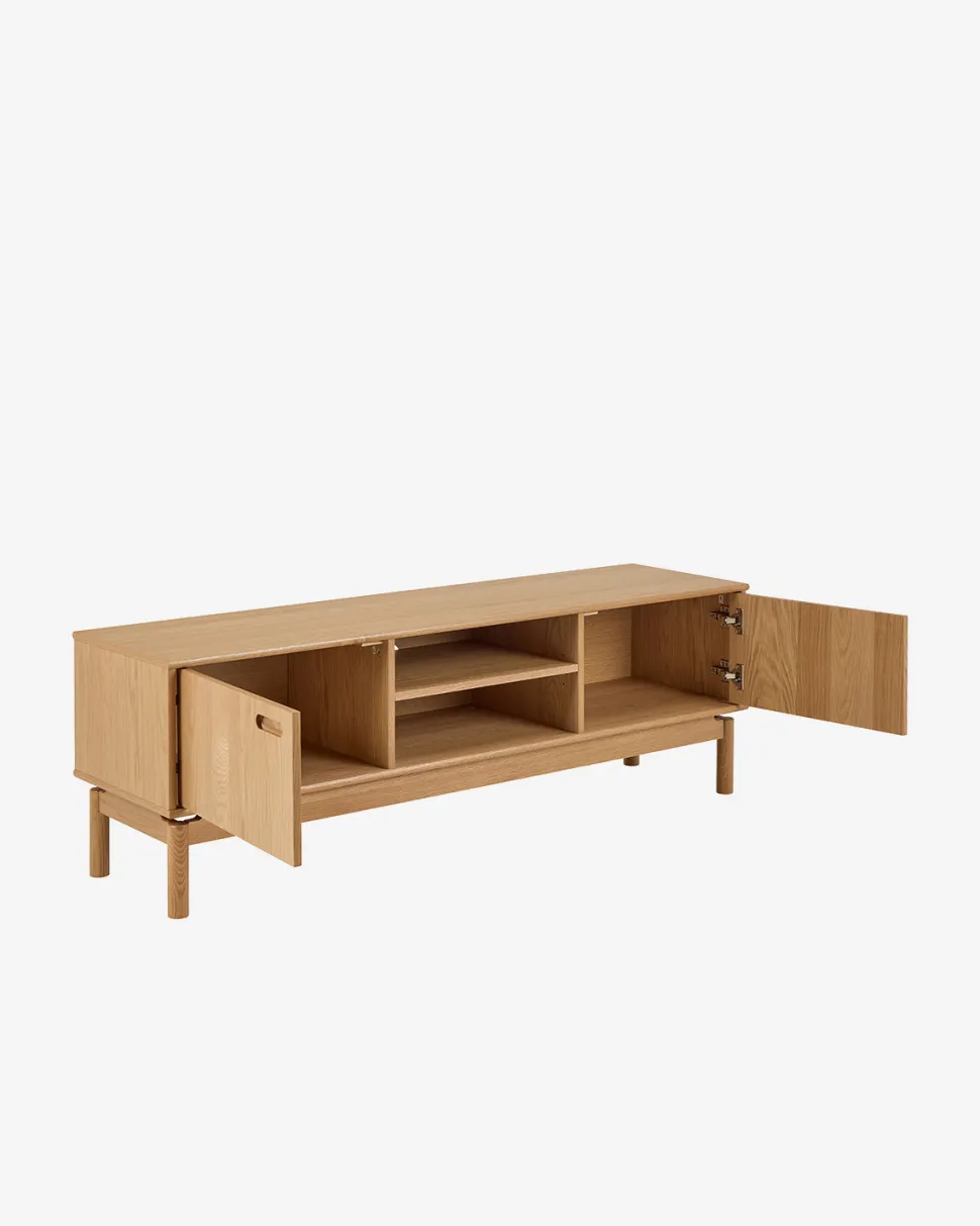 Opbygningen består af 2 låger på siderne med lukket opbevaring samt et åbent rum med hylde i midten – ideelt til elektronik, mediebokse eller dekoration. Det slanke design giver et luftigt udtryk under TV-området og passer godt ind i både minimalistiske og nordiske hjem.