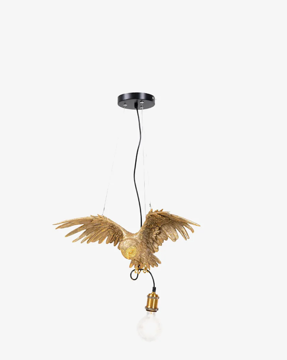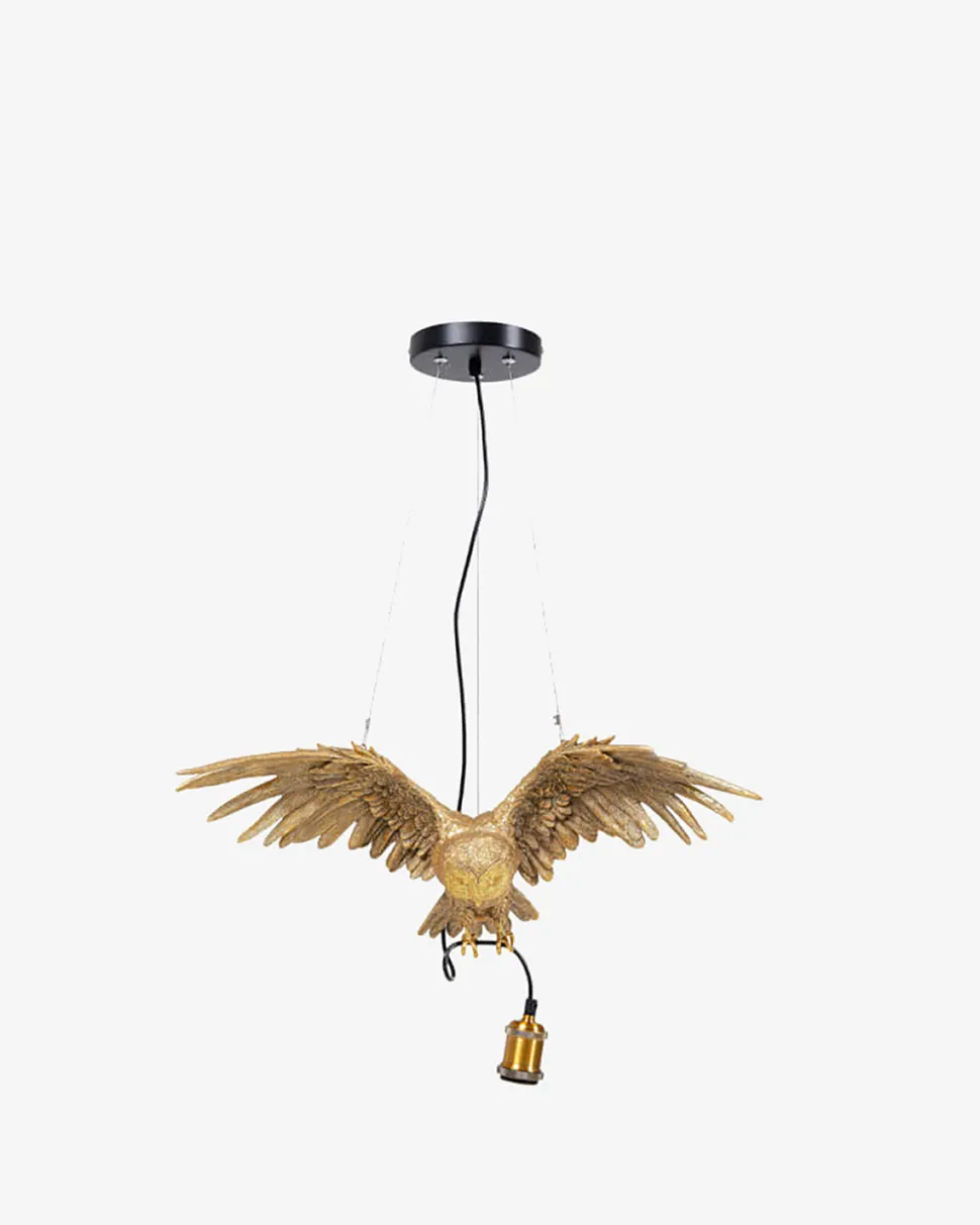 Uglelampen er malet i guldfarve, og ser imponerende ud over spisebordet med det store vingefang.