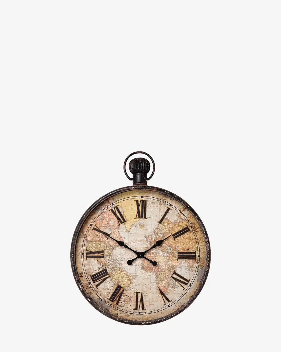 Et nostalgisk ur formet som et stort lommeur og med verdenskort påtrykt. Uret er beregnet til ophæng på væggen, og er udført i jern og glas. Uret bruger almindelige AA-batterier.