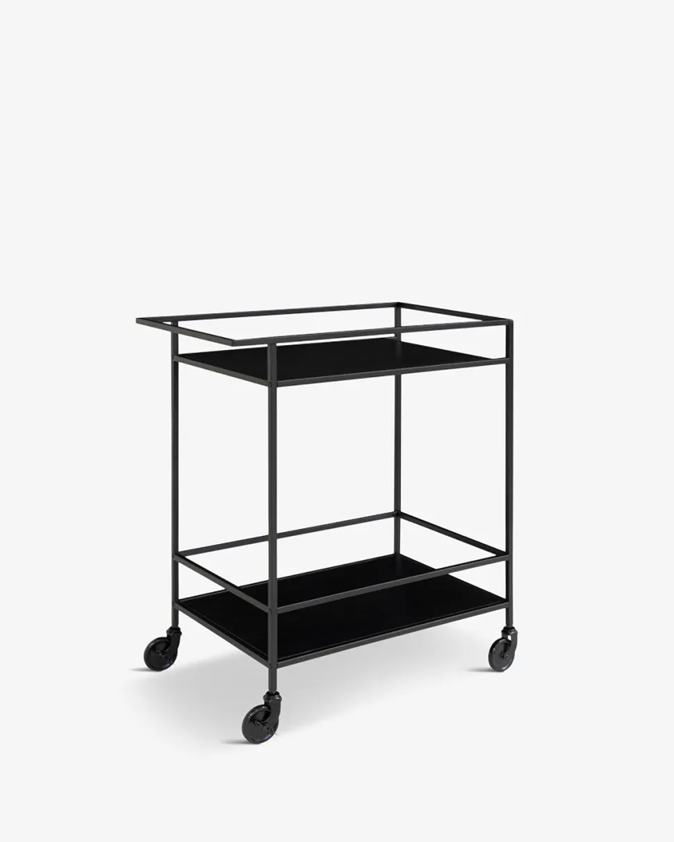 Barvogn udført i enkelt og stilfuldt design af sort lakeret metal, med to hylder med plads til drinksglas og flasker.