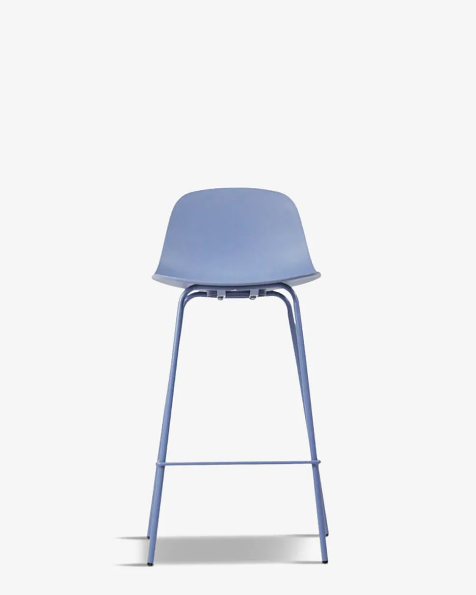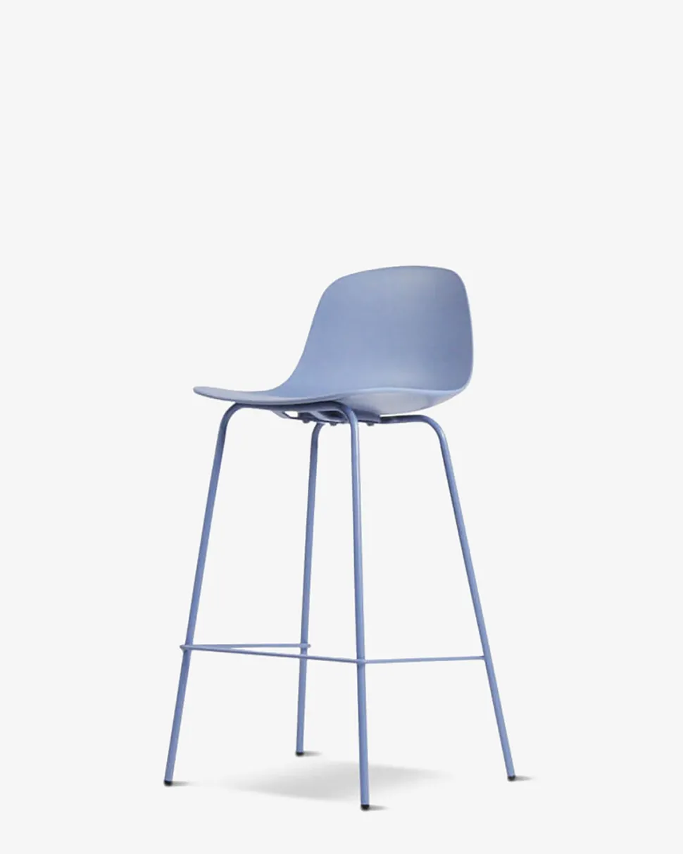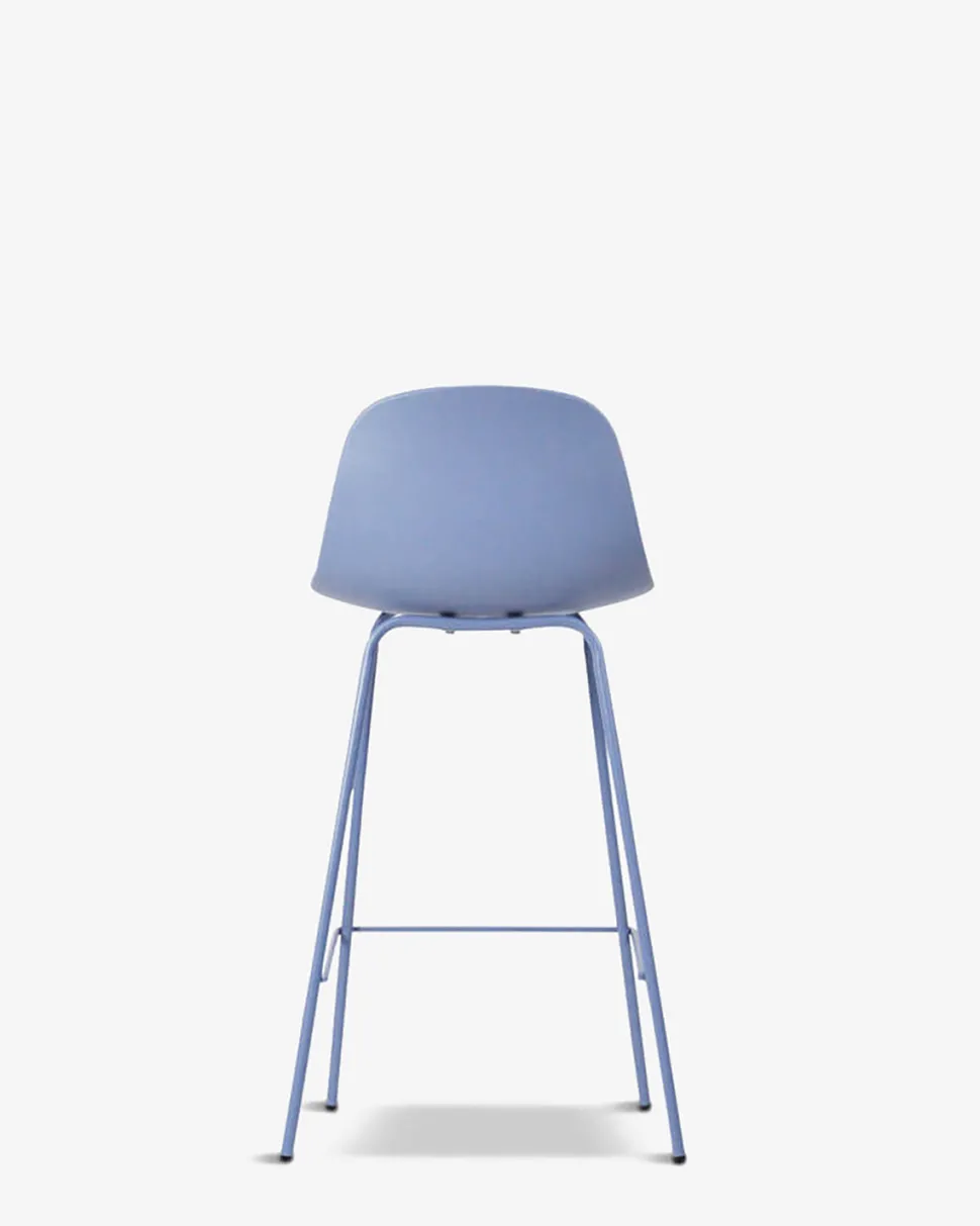 Whitby barstolen findes i 5 trendy farver, her vist i støvet blå, med matchende metalben.