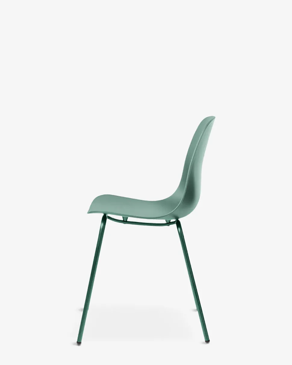 Whitby stolen fås i fem trendy farver, her vist i grøn, med matchende grønne metal ben.