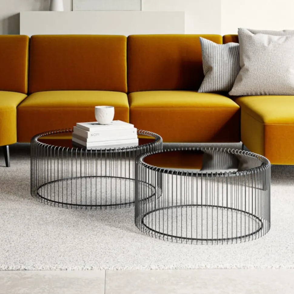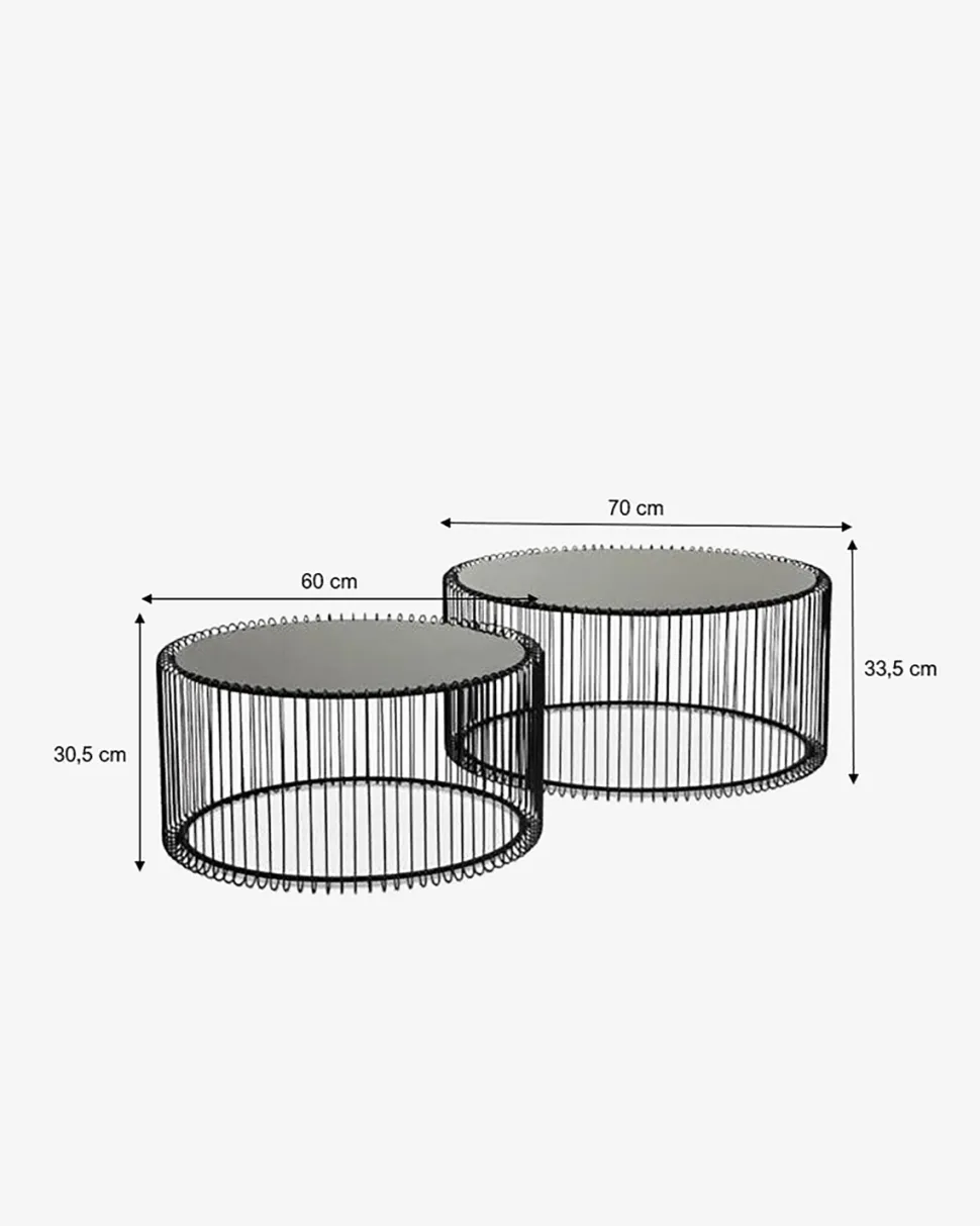 Sofabordssæt i sort metal og med sort glasplade. Meget elegant bord i betagende design. Den sorte glasplade spejler sig i sine omgivelser og giver en spændende effekt. Brug bordene sammen eller hver for sig afhængig af sofaens størrelse.